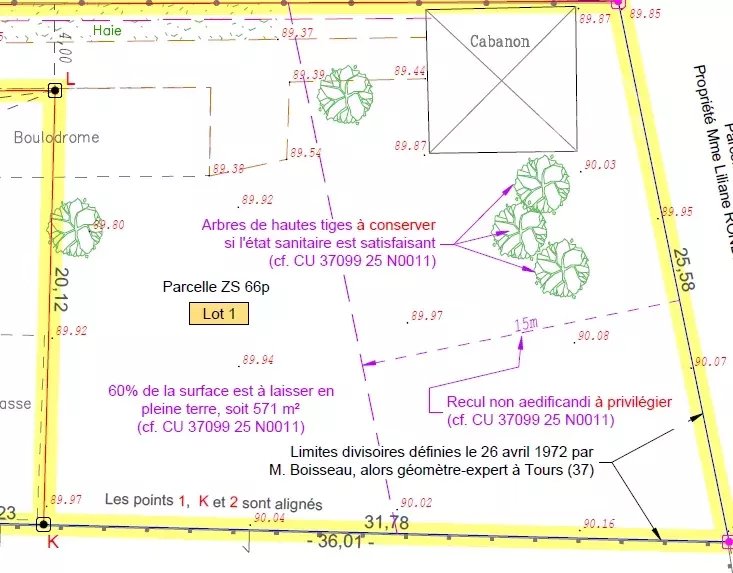Cimm Immobilier vous présente un beau terrain à bâtir sur la commune de Druye (37190). Hors lotissement, vous profiterez d'un environnement dégagé sur la campagne. A seulement 2.5km du bourg ou vous trouverez écoles maternelle, primaire, transport scolaire pour le collège (René Cassin à Ballan-Miré) et la gare SNCF ligne TOURS CHINON cet emplacement est idéal pour bénéficier du calme de la campagne tout en étant à proximité de Tours (15 min des 2 Lions par A85 ou D751) Caractéristiques techniques : - Le terrain est plat et arboré, clôturé en partie sur les extérieures - Possède un garage de 40m² (à conserver ou non) - Terrain non viabilisé - Assainissement autonome à réaliser Surfaces : En arrière plan par rapport à la route, le terrain possède une voie d'accès privative d'env 50 mètres linéaires (pour viabilisation eau, électricité et télécom) actuellement carrossable. Puis, vous arrivez sur votre terrain, environ 720m² avec 25mètres de largeur x 35mètres environ de profondeur. La profondeur est d'orientation Nord-Sud Cu opérationnel positif Plan de bornage définitif déposé Ce terrain n'attends plus votre venue et votre projet de construction! Ce bien vous est présenté par Félix DUBUS 150,000 € Honoraires d'agence non inclus - Honoraires agence: 6%TTC Honoraires à la charge de l'acquéreur - Félix DUBUS - Agent commercial - EI - RSAC TOURS RSAC 827 907 502 - RCS 81119247500028 - Caisse de garantie Groupama