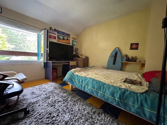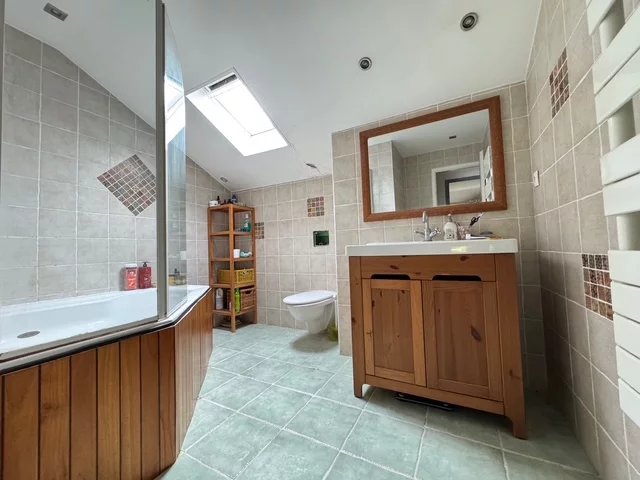À l’étage, trois chambres lumineuses, toutes dotées de rangements intégrés, accueillent confortablement famille et invités. La salle de bains avec WC vient parfaire cet étage.