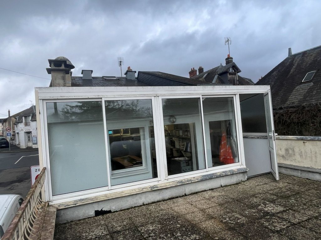 LA BAZOCHE GOUET. Maison ancienne avec terrasse. La partie habitation comprend une ancienne boutique de 25m², un salon de 15m², une pièce de vie de 60m², cuisine 8m², wc, cave et garage. A l'étage trois chambres indépendantes et une salle de bains. Chauffage central. Grenier. (7.00 % honoraires TTC à la charge de l'acquéreur.)