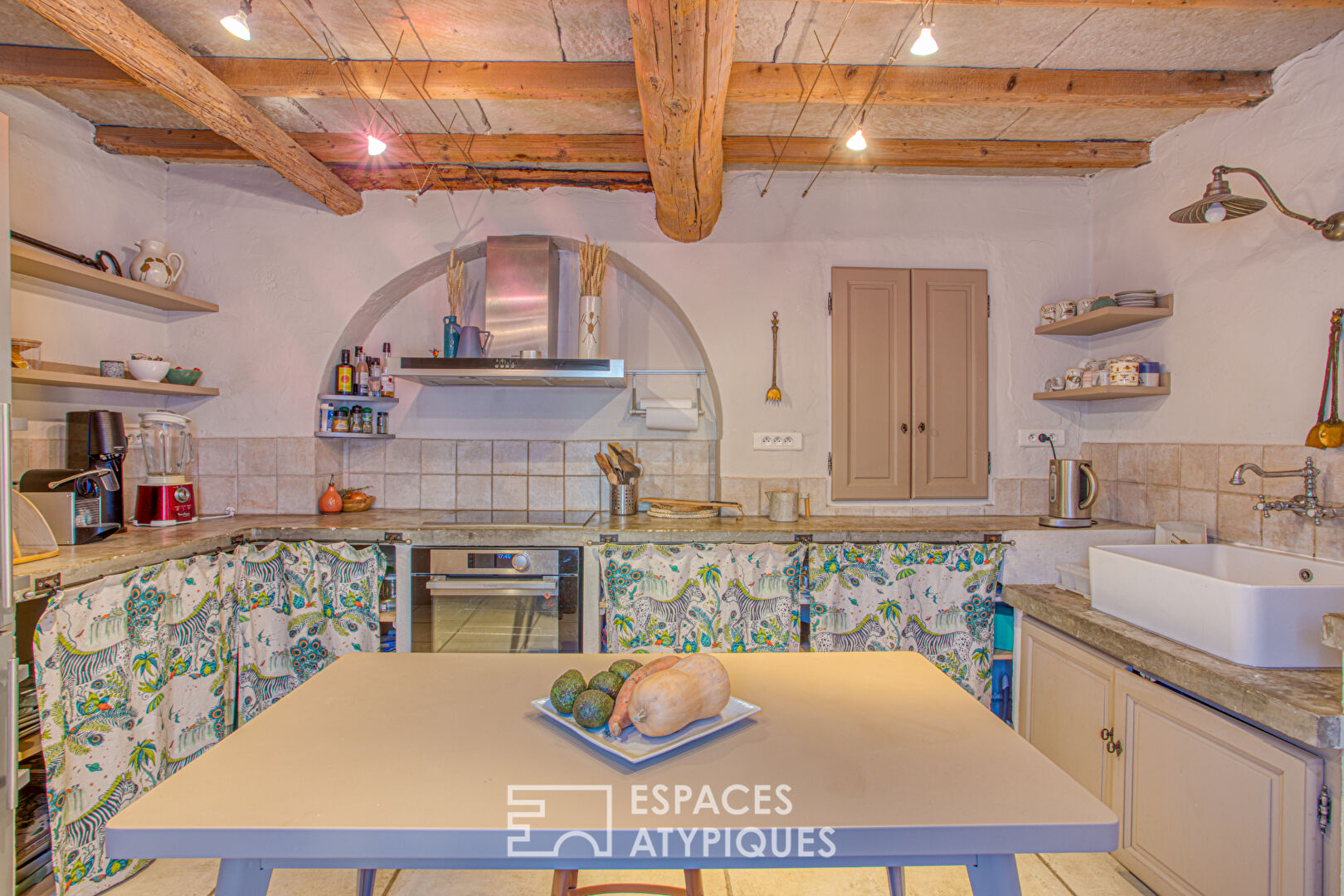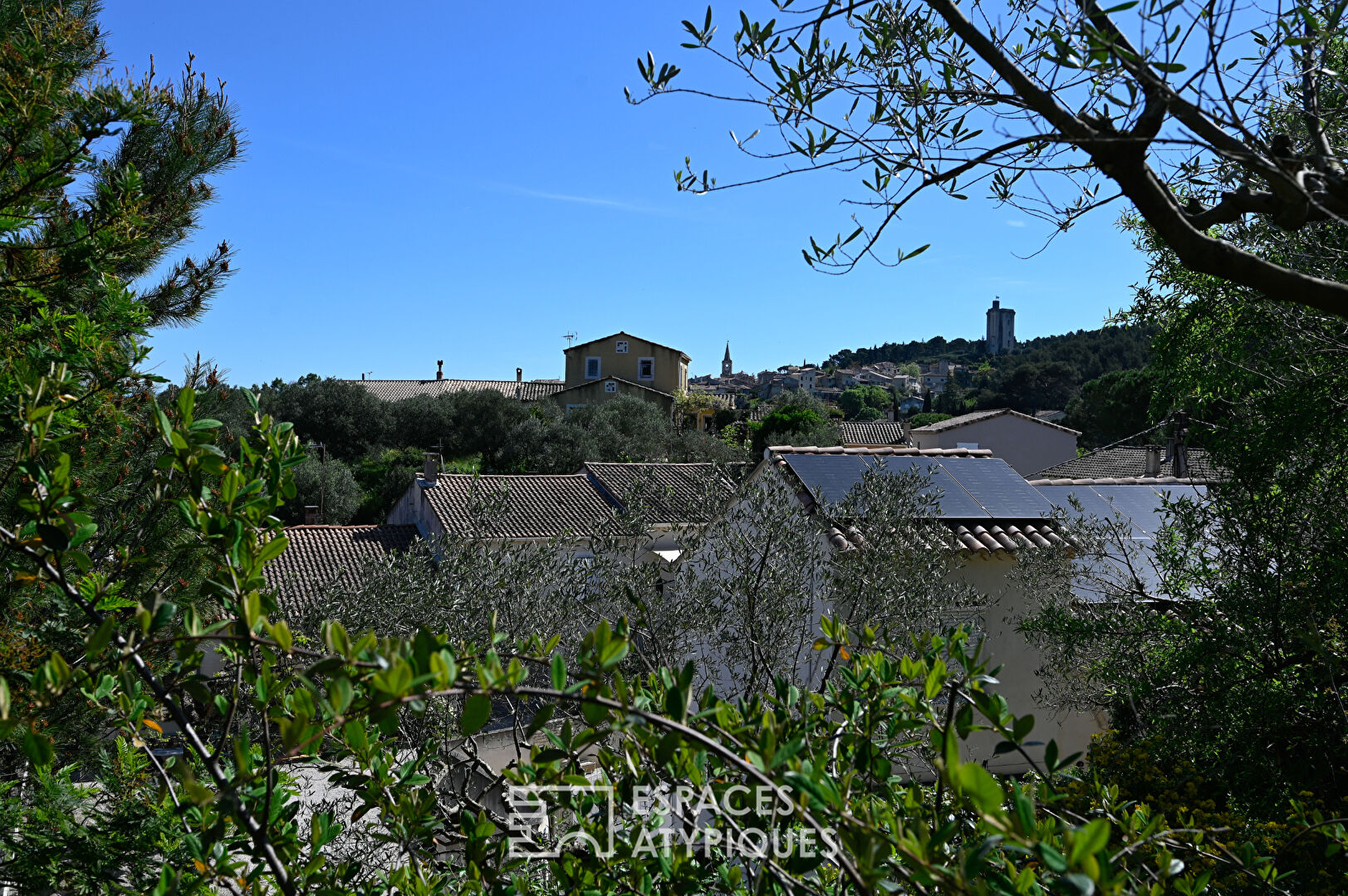 A 8 minutes de la gare TGV, cette jolie maison aux volets bleus se blottit au pied de la Montagnette, dans une paisible impasse du village pittoresque et animé de Barbentane. Construite en 1930, elle a été rénovée avec goût, dans des tons sable avec de beaux matériaux. Le seuil franchi, l'espace de vie déploie en enfilade une gracieuse cuisine dînatoire avec son plan de travail en béton ciré et son évier de ferme ancien, une spacieuse salle à manger, réchauffée l'hiver par son poêle à bois et un vaste salon, lumineux grâce à un puits de lumière et une baie vitrée qui s'ouvre sur un escalier menant à la terrasse puis au jardin en restanques. A l'étage, une avenante salle de bain jouxte la chambre parentale (16m2)et son élégant bureau-bibliothèque de 22m2, dont la porte-fenêtre communique avec la terrasse ensoleillée. Le jardin facile à entretenir, cache à l'ombre de ses oliviers et ses chênes verts la table des pique-nique estivaux et accueille sur une terrasse de 70 m2 une grande piscine orientée plein sud où il fera bon profiter d'agréables baignades dans la chaleur de l'été. L'espace nuit du 3ème niveau de la maison abrite en sous pente, dans une douce ambiance, deux coquettes chambres climatisées de 15 et 12m2. Une salle d'eau, un car port et un garage de 22m2 complètent ce bien. Aux portes d'Avignon et à la croisée des routes culturelles et touristiques de la Provence, cette maison de famille allie le charme d'un lieu de villégiature et le confort d'une vie de village avec toutes les commodités à proximité., Classe ENERGIE : D Classe CLIMAT : B Prix moyens des énergies indexés sur les années 2021, 2022, 2023 (abonnements compris)entre 2 490 euros et 3 440 euros par an Les informations sur les risques auxquels ce bien est exposé sont disponibles sur le site Géorisques: www.georisques.gouv.fr