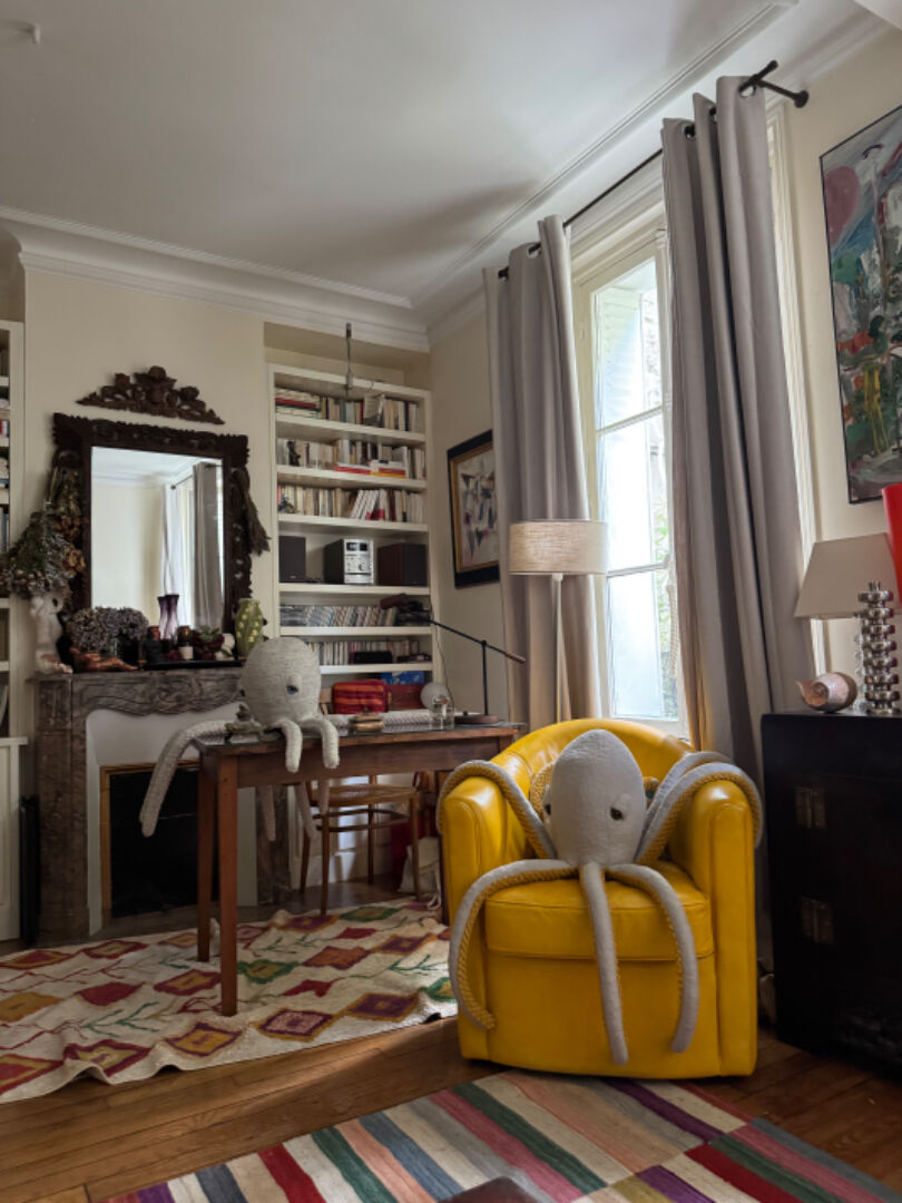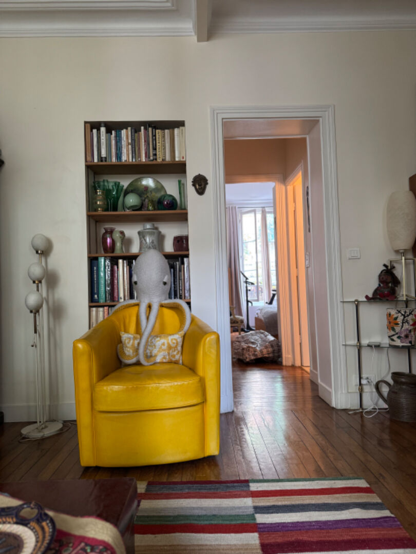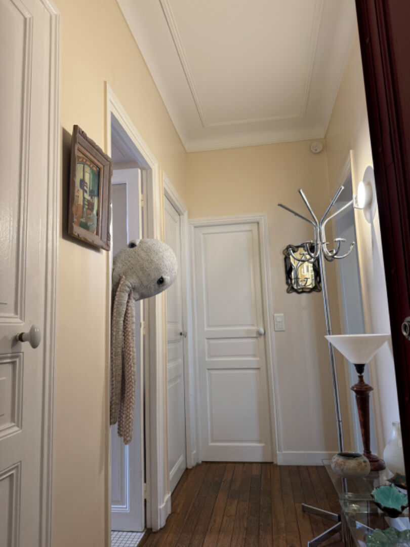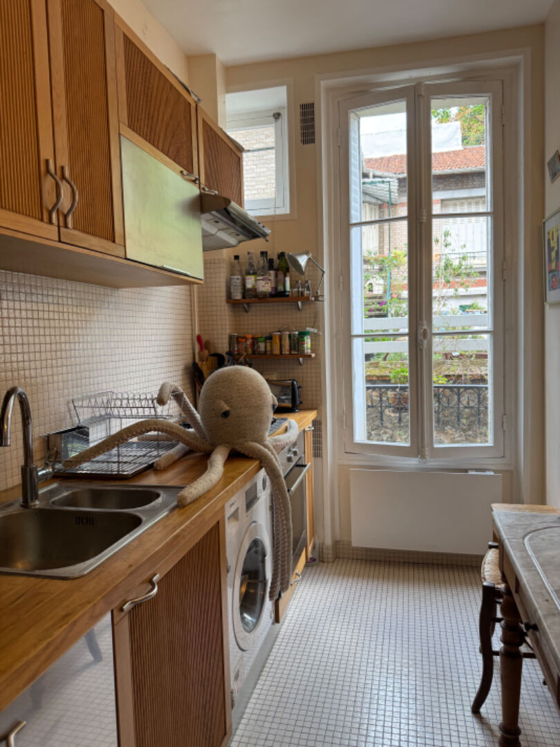 Jourdain Pyrénées / Buttes Chaumont: en un immeuble ancien de charme à la jolie cour pavée verdoyante, un appartement parfaitement distribué ( plan en étoile ) comprenant entrée, cuisine, salle de douches cabinet d'aisance, séjour double. En double orientation sur deux cours verdoyantes, il est clair, calme, et ensoleillé. Parquet de chêne, moulures, bonne hauteur sous plafond. L'appartement est vendu avec un débarras situé en face sur le pallier, et une cave de 8 m2. (3.21 % honoraires TTC à la charge de l'acquéreur.)