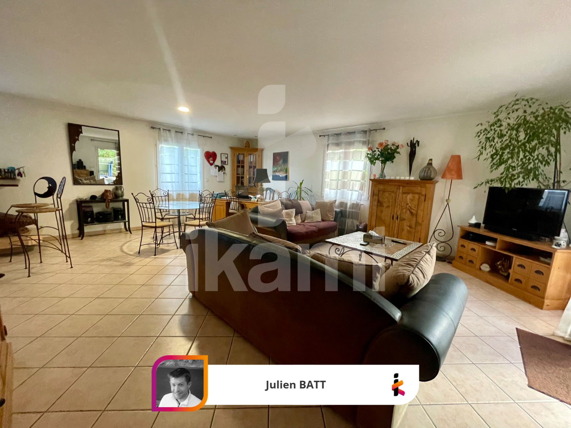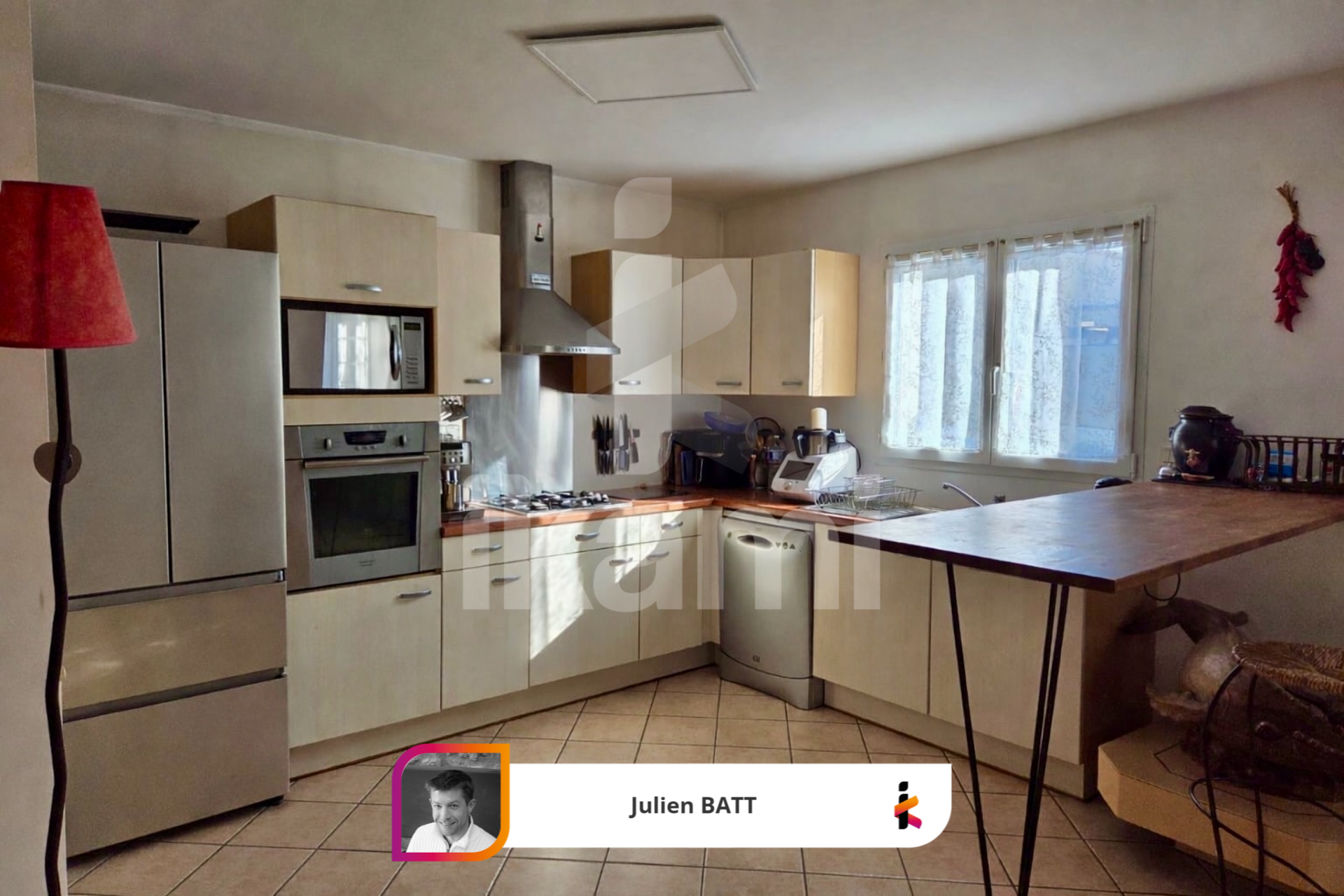 ROMANS SUR ISERE - Située dans un très bon quartier proche de toutes les commodités, villa de plain-pied (2004) de 104 m2 habitables, comprenant une grande pièce de vie de 50 m2 avec cuisine équipée, un cellier/buanderie, 3 chambres avec placards et une salle d'eau.