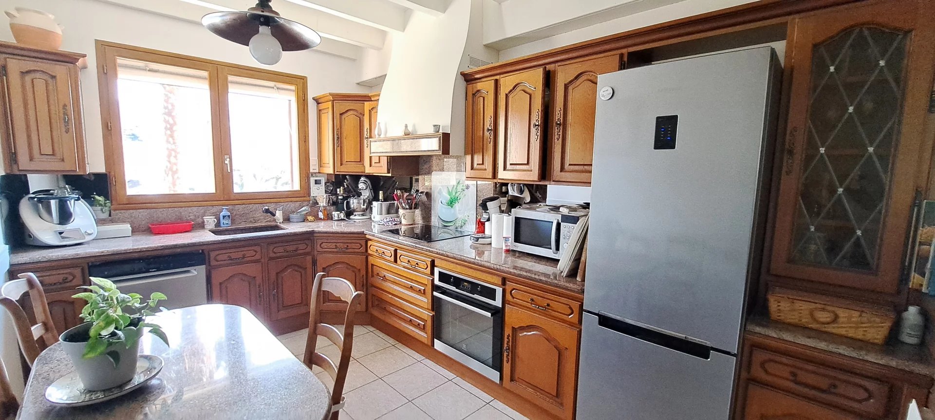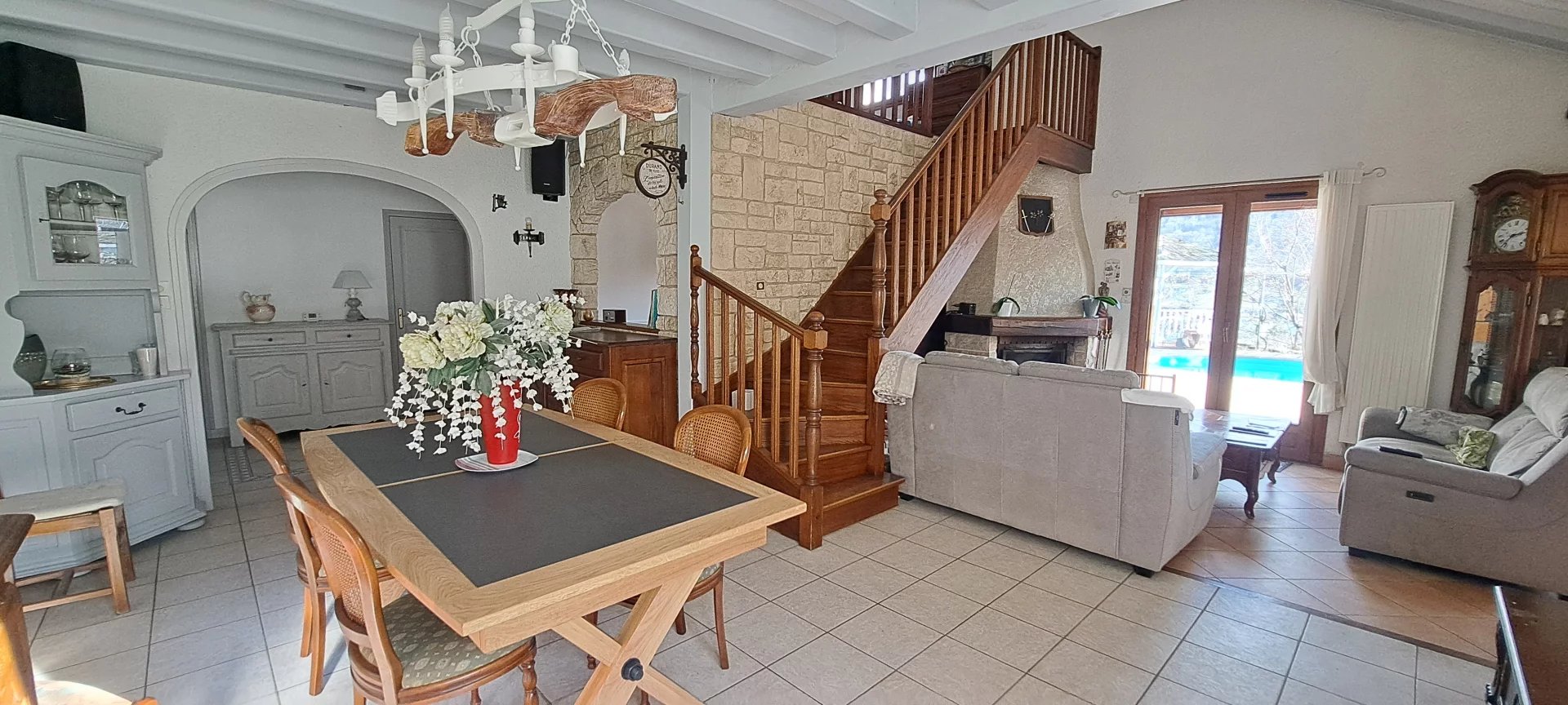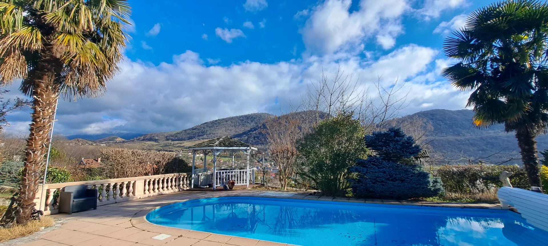 ESPACE IMMO 38 - Stéphanie STOLTZ (o7 61 29 o1 41) vous propose une belle villa de 150 m2 habitables avec piscine sur un terrain clos et arboré de 1725 m2 au calme. La partie arrière de la maison est escarpée, exploitable en potager, fleurs... Ce bien vous séduira par sa magnifique vue dégagée et son agréable terrasse pour profiter pleinement de la piscine et des espaces extérieurs. Il se compose d'un sas d'entrée de 13 m2 avec four à pain et barbecue permettant l'accès à la partie intérieure composée d'un hall d'entrée avec placard, d'un grand séjour-salon ouvert sur une véranda chauffée (poêle à granulés) créant un espace de vie de 51 m2 avec accès terrasse, une cuisine équipée, 3 chambres, une salle d'eau, une salle de bains et un wc séparé. A l'étage bénéficiez d'une mezzanine servant de bureau ou coin détente, ainsi qu'une grande chambre de 20 m2 avec wc. Sous-sol de 60 m2 avec partie garage, buanderie, cellier. Chauffage par pompe à chaleur air/eau, cheminée à foyer fermé, poêle à granulés flamme verte et une partie en plancher rayonnant électrique, toiture isolée. DPE : C Huisseries double vitrage, volets roulants électriques, moustiquaires, ramassage scolaire, bus 66 et 71. Taxe foncière : 2031€ La présente annonce immobilière a été rédigée par Stéphanie, agent commercial en immobilier immatriculé au RSAC de Grenoble sous le numéro 844 305 201. Les honoraires sont à la charge du vendeur. Les informations obligatoires sur les risques auxquels ce bien peut être exposé sont disponibles sur le site Géorisques : www.georisques.gouv.fr