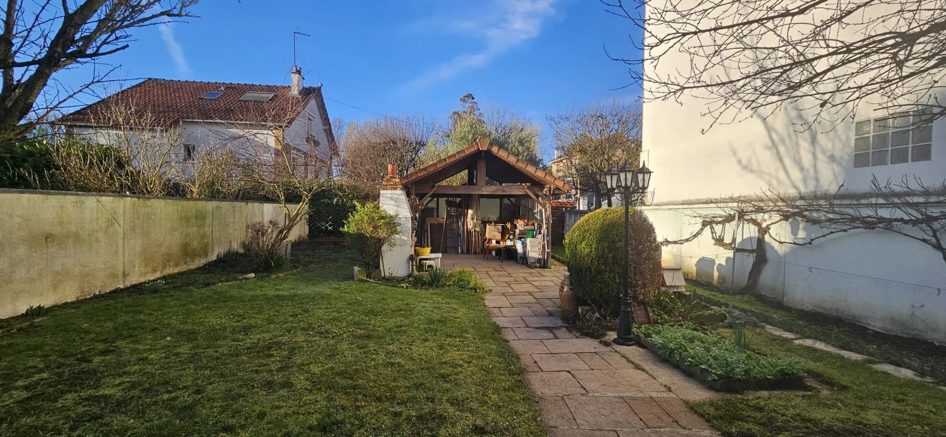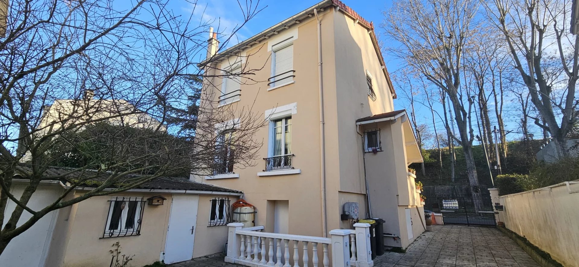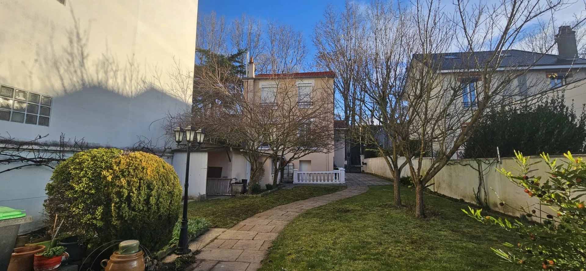 Proche toutes commodités, RER futur métro, écoles et commerces. Maison ancienne de 5/6 pièces de 168.25m² surfaces utiles et 90.79m² en habitable, sur terrain clos de 413m². Comprenant : au rdc: hall d'entrée, WC, séjour double accès terrasse couverte, cuisine équipée ( possible US), bureau avec placards, à l'étage : 3 chambres spacieuses, salle de bains avec WC avec combles aménagés. Le tout édifié sur sous-sol total en RDJ : buanderie, chaufferie gaz, garage sur rue avec portail automatique, dépendances, stationnement pour plusieurs véhicules et beau Jardin sans vis a vis. A voir !