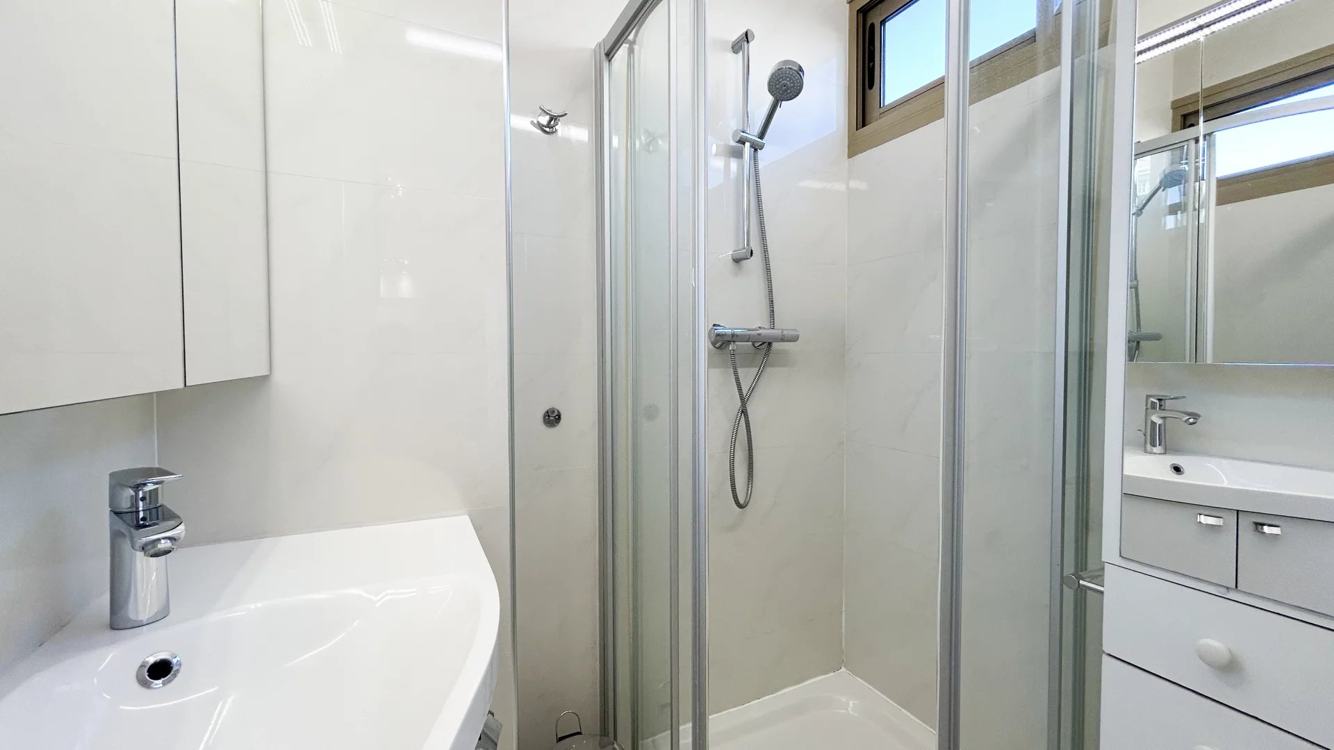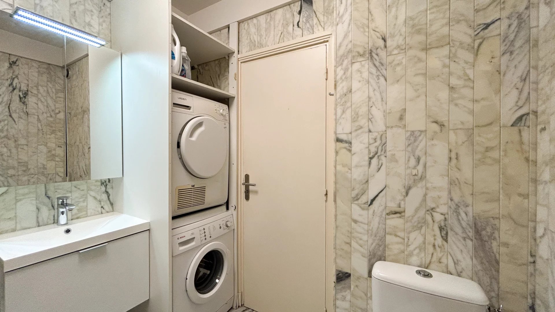 L'appartamento si apre su un ingresso con armadietti, che conduce a un luminoso soggiorno con una cucina a pianta aperta completamente attrezzata, ideale per intrattenersi. La camera da letto dispone di un proprio bagno con doccia e di una toilette separata per un maggiore comfort e comodità. Un ulteriore bagno con servizi igienici, oltre a corridoi e ripostigli, completano l'elegante disposizione interna di questa proprietà.
