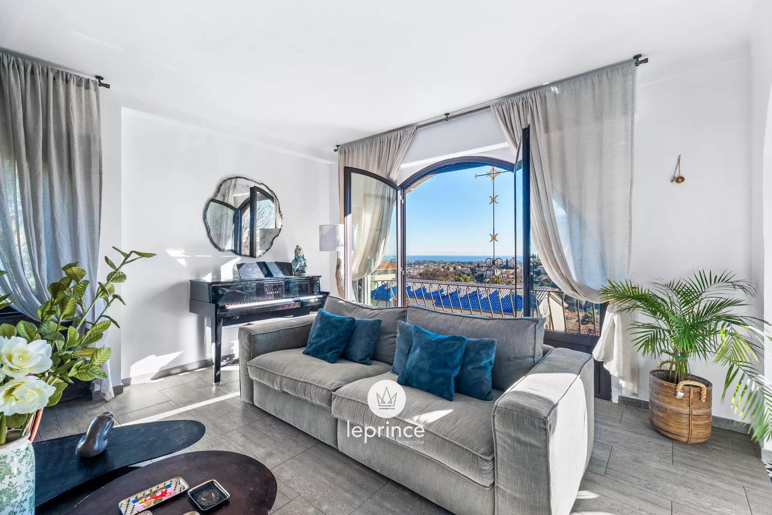 La zona giorno offre una vista aperta sul mare, sulla Chapelle du Rosaire, monumento storico classificato, e sul pittoresco villaggio di Saint-Paul-de-Vence, creando un ambiente di vita elegante e rilassante.