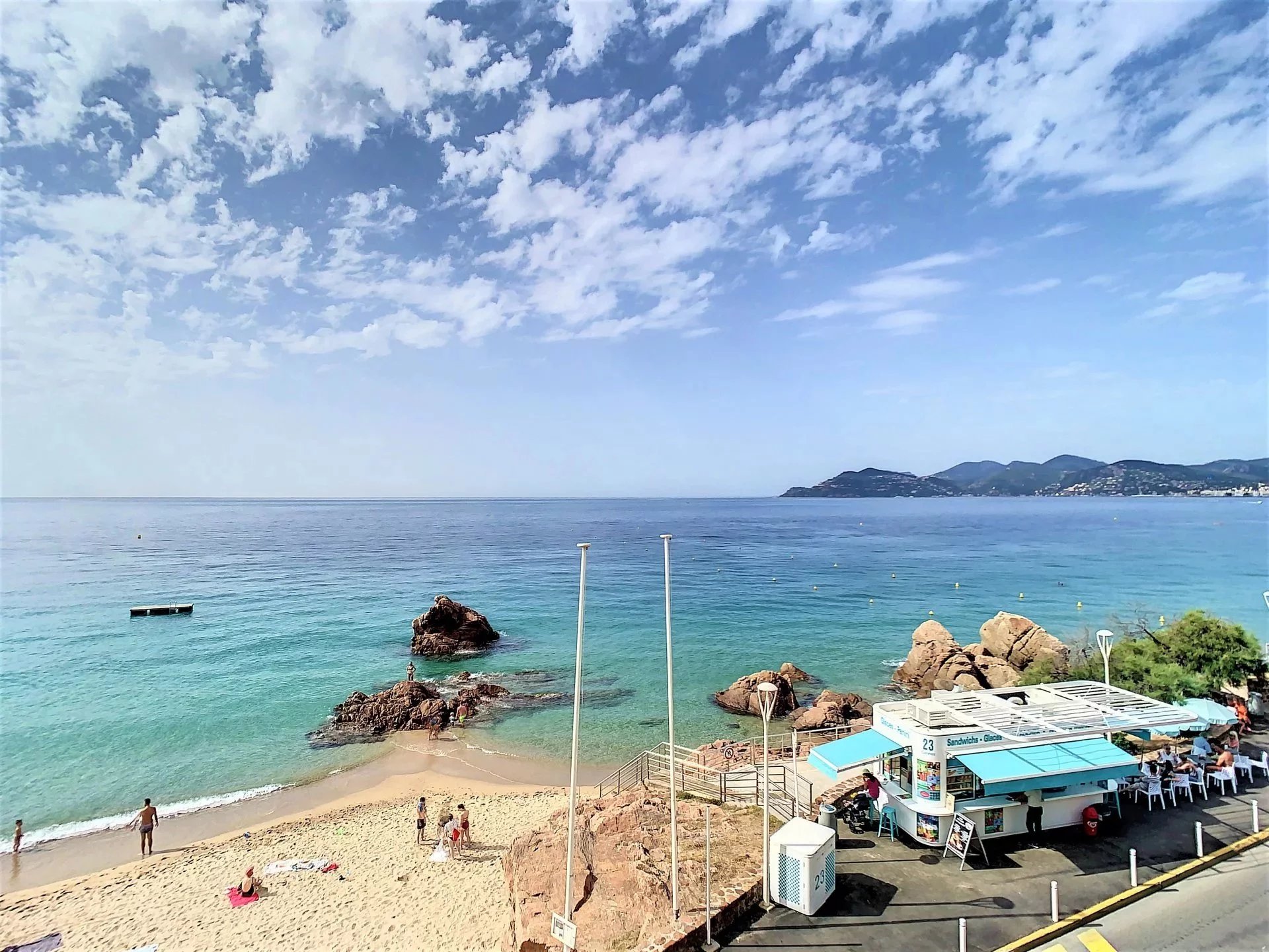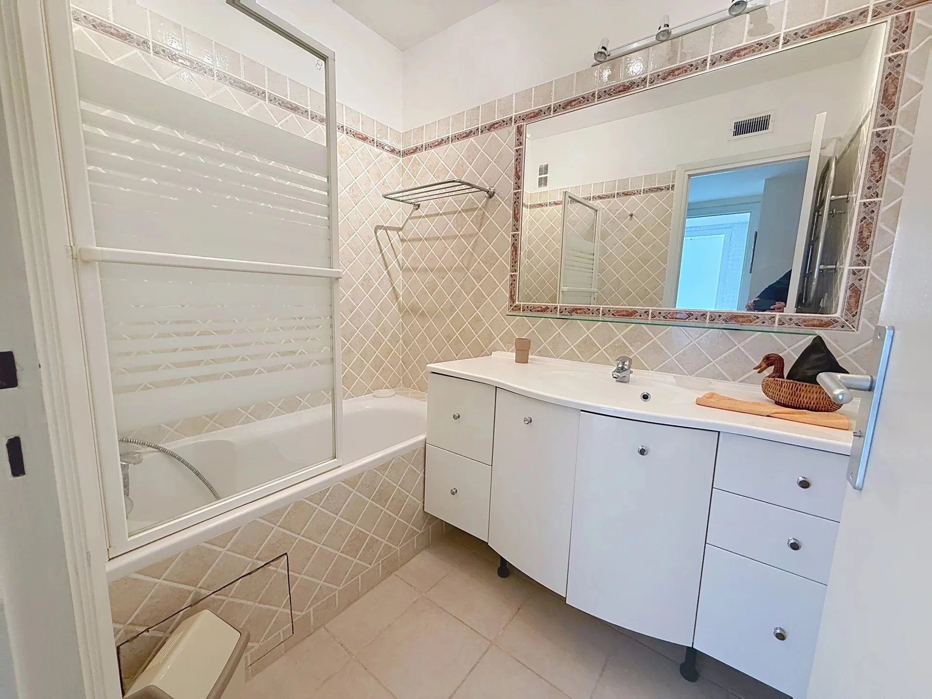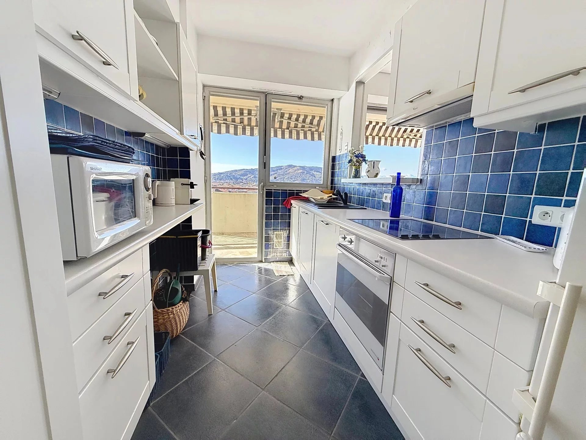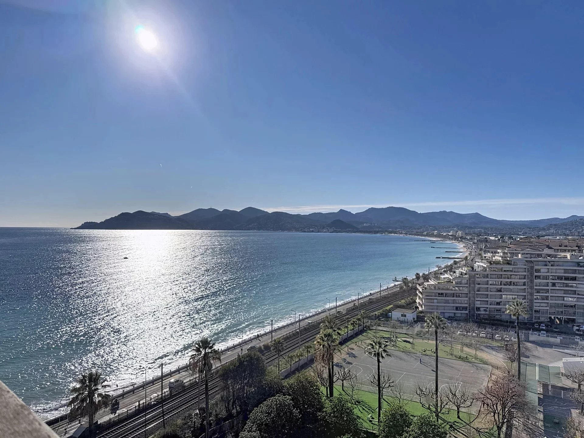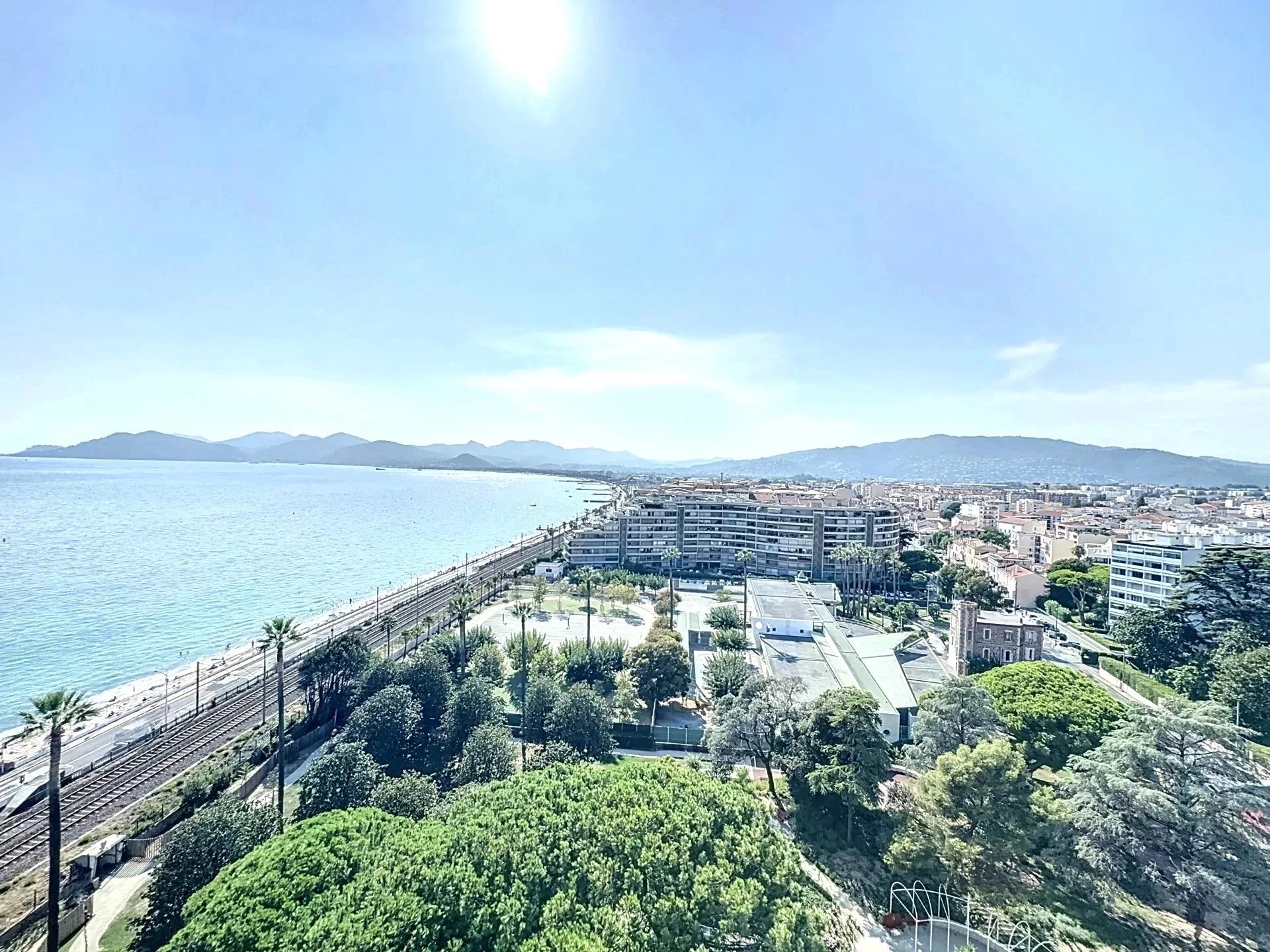 Dans une résidence de grand standing avec accès direct aux plages appartement de 2 pièces avec vue mer panoramique. A proximité des commerces, des plages et des transports en commun. Séjour, cuisine et chambre donnant sur Grande Terrasse Résidence avec Gardien, Parc Arboré En Annexe : Un parking extérieur privé et une cave