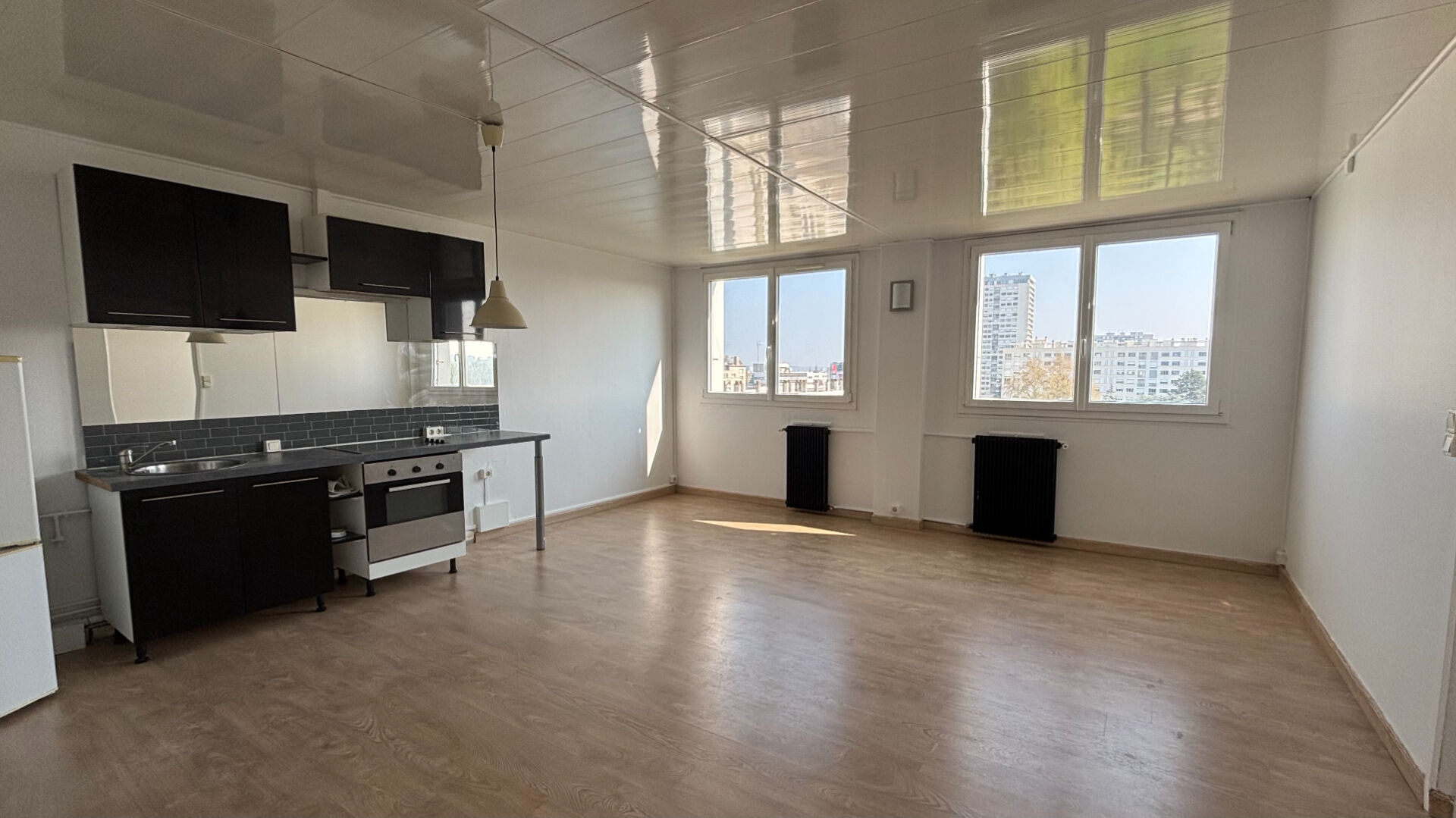 Vue sur le Cher - Appartement T2 d'environ 46 m², situé au 7ème étage, exposé Est, comprenant : entrée avec placard, séjour avec cuisine ouverte, chambre et salle d'eau avec WC. Chauffage et eau collectif. Local à vélo. Proche tram et bus. Disponible de suite.