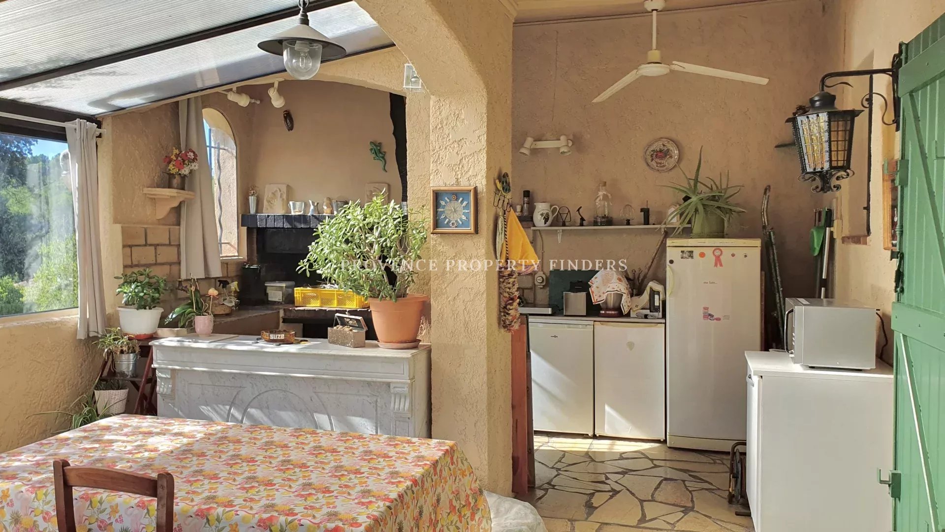 La maison vous offre un grand salon/salle à manger avec un bar et cheminée, Cuisine et un verandah (grand jardin d'hiver) extérieur(couvert) avec 2ème cuisine.