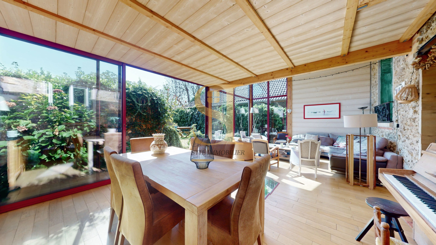Développant 143 m² habitables, la maison propose au rez-de-chaussée une entrée, un salon cosy, une salle à manger chaleureuse, une cuisine dinatoire conviviale, ainsi qu'une magnifique véranda de style architecte de plus de 35 m², exposée plein sud. Véritable pièce de vie à part entière, elle offre une luminosité exceptionnelle et un accès direct vers l'extérieur.