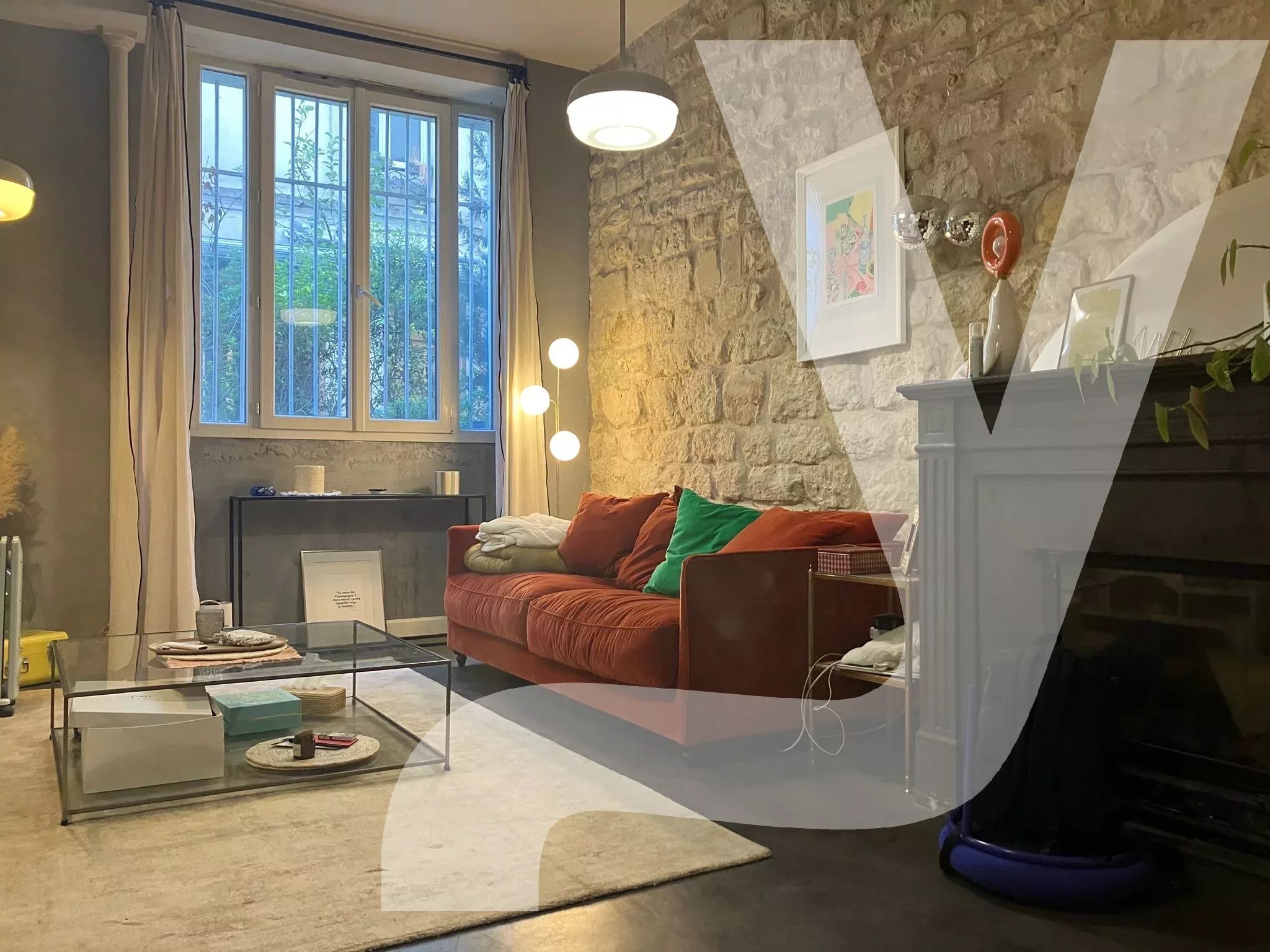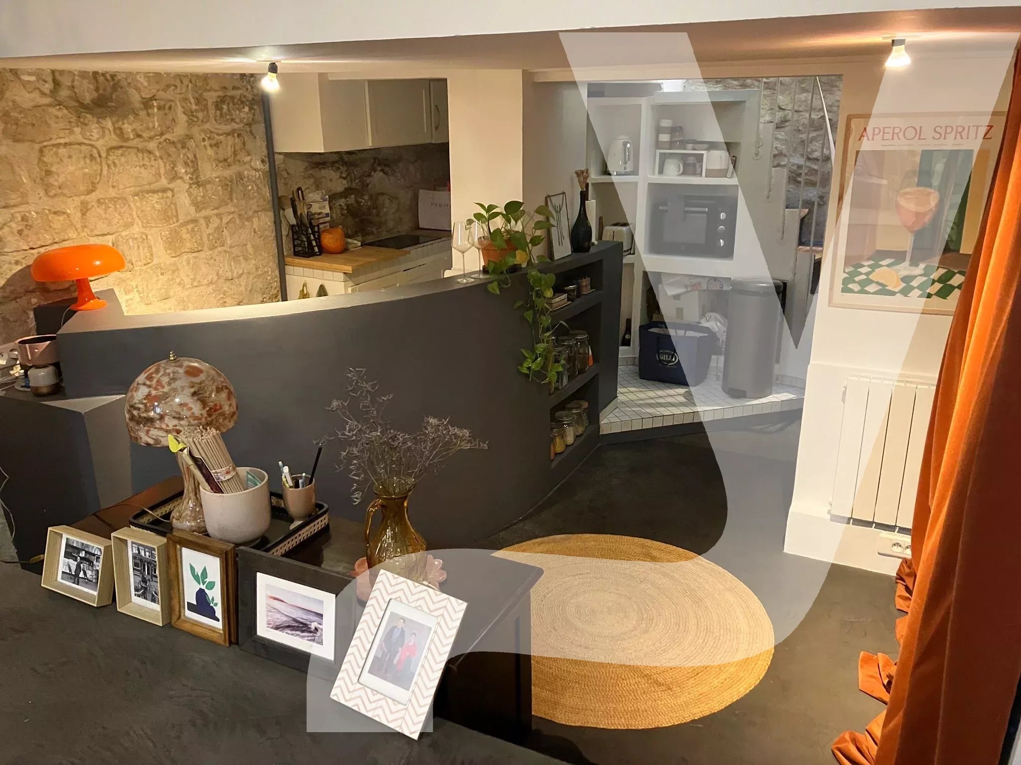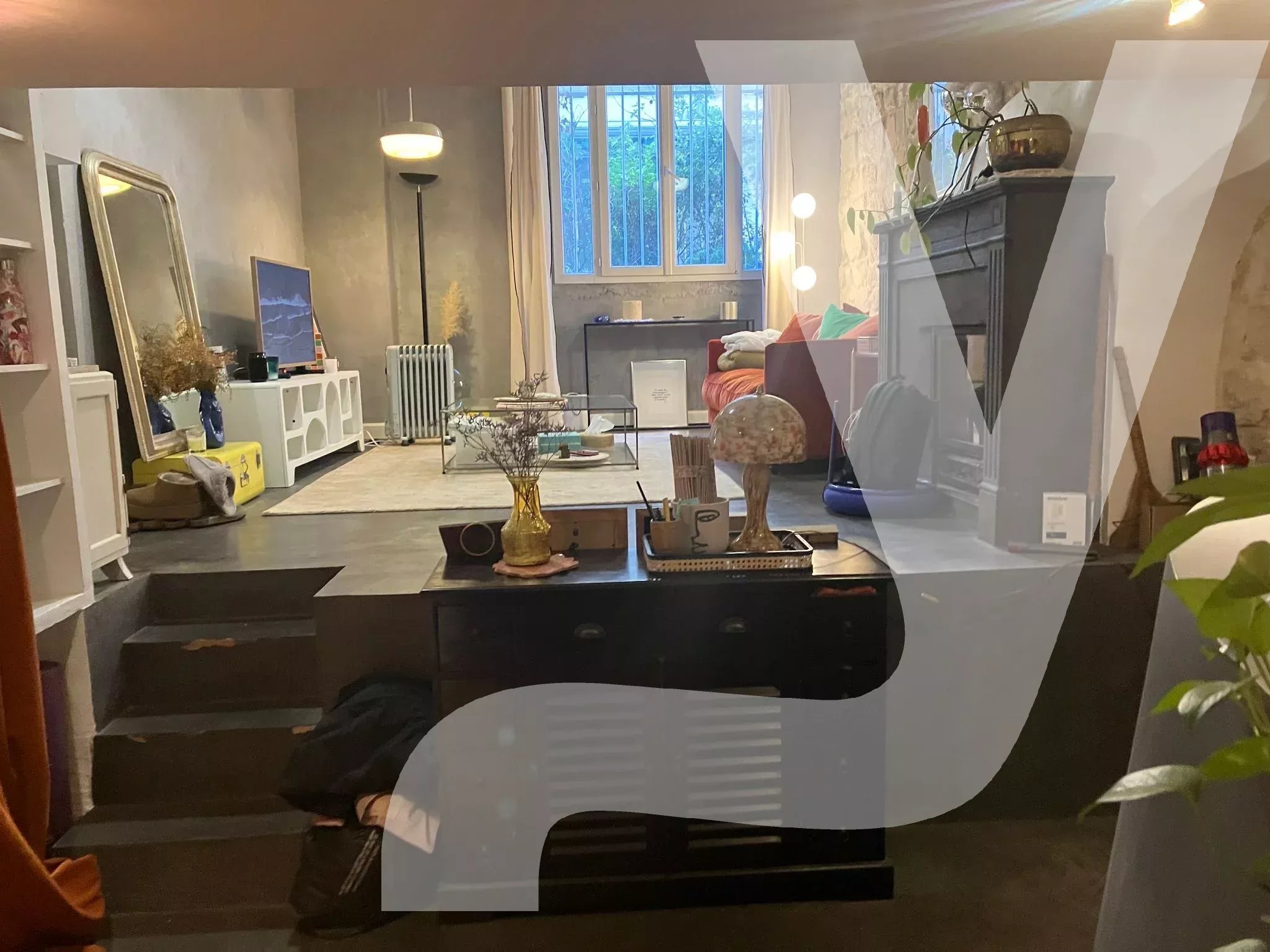 Le séjour, doté d'une belle hauteur sous plafond, offre une atmosphère chaleureuse et authentique, sublimée par une cheminée et un sol en béton ciré à l'esthétique contemporaine. En contrebas du séjour, une cuisine équipée s'intègre harmonieusement à l'ensemble, créant un espace fonctionnel et convivial.