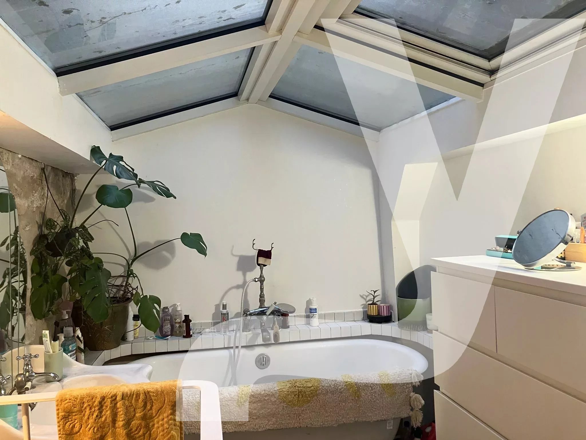 La salle de bains sous verrières, lumineuse et élégante, renforce le caractère résolument contemporain de l'appartement.