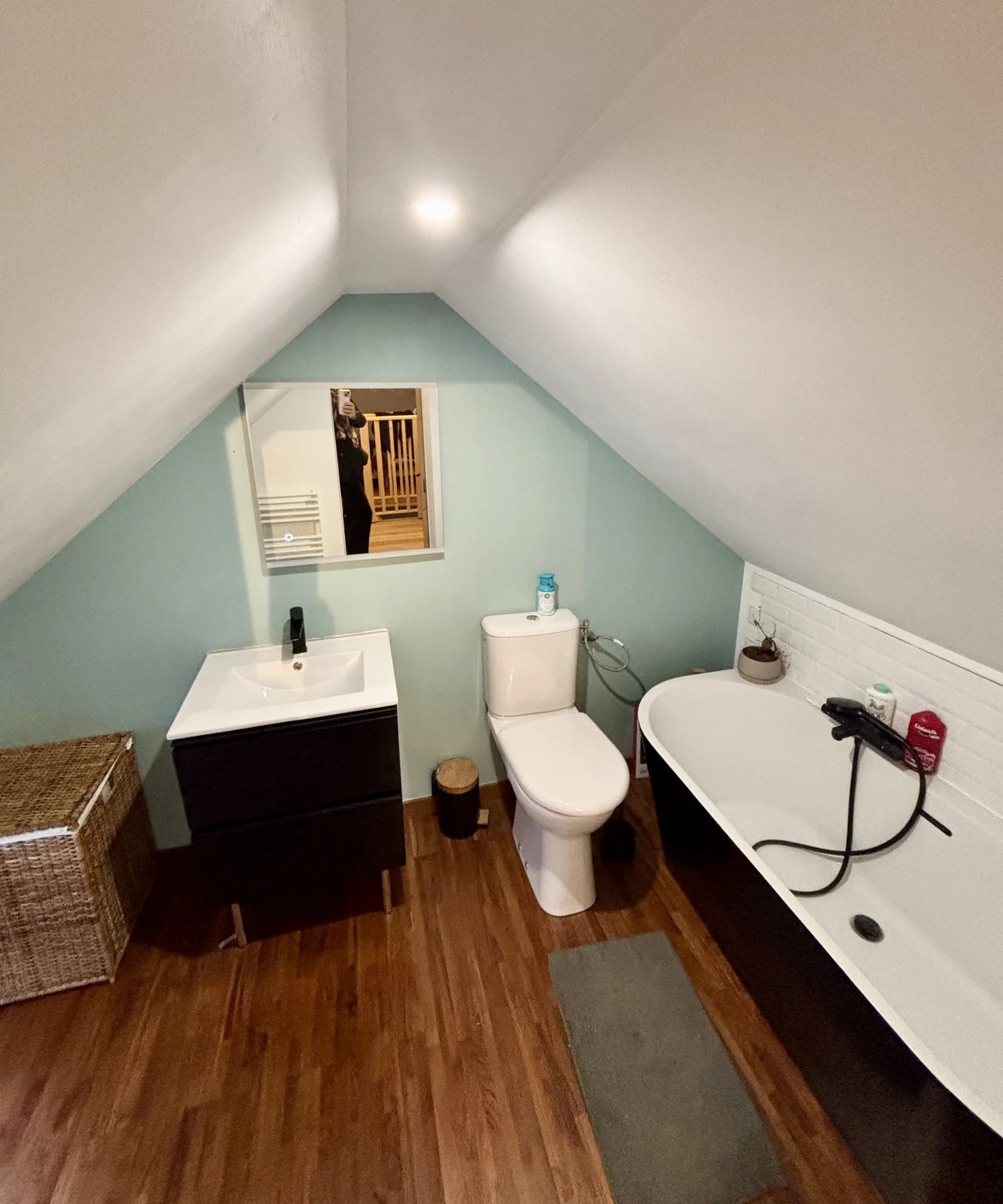 A l'étage, une chambre, une salle de bains avec un toilette.