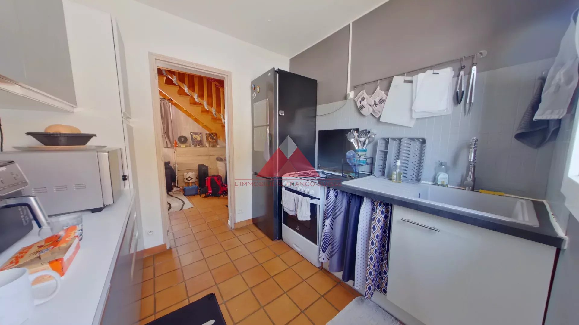 Elle comprend au rez-de-chaussée : une buanderie, une cuisine, un salon/ séjour agrémenté du poêle à pellets, et donnant accès à la terrasse, et un WC séparé.