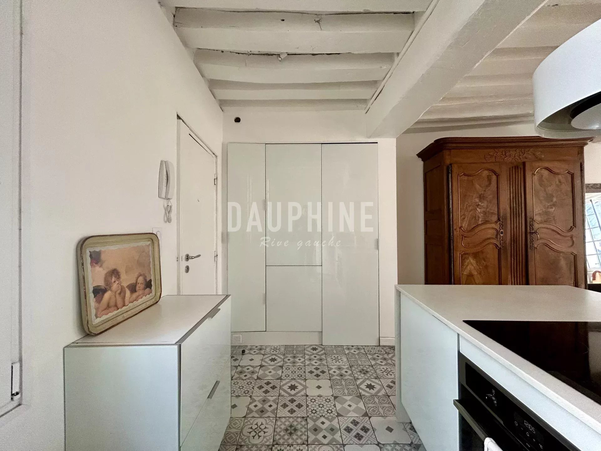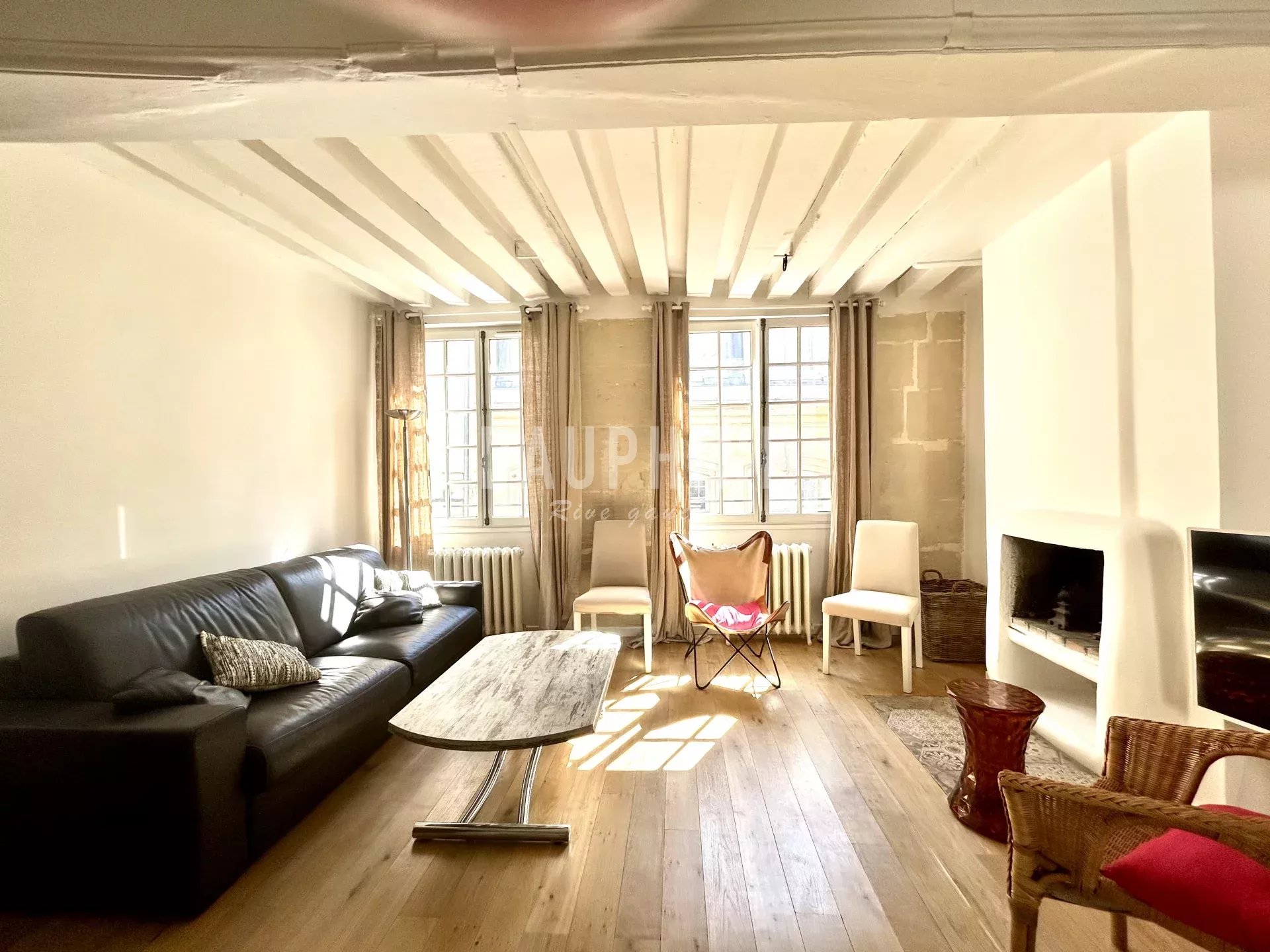 Le séjour, décoré avec goût, est baigné de lumière grâce à ses grandes fenêtres. La cuisine ouverte est équipée de façon moderne, facilitant ainsi la préparation de vos repas. Le charme des poutres apparentes et du parquet ajoute une touche d'élégance à l'ensemble du bien.