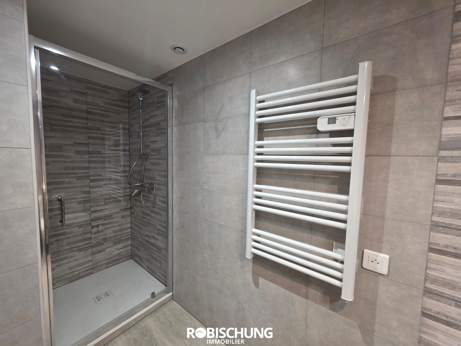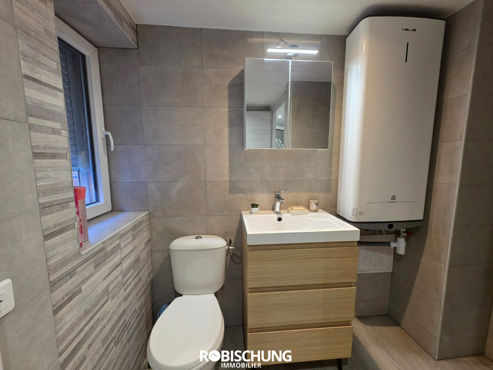 La salle de bains est équipée d'une douche, d'un WC, d'un meuble vasque avec rangement, ainsi que d'un espace pour une machine à laver.