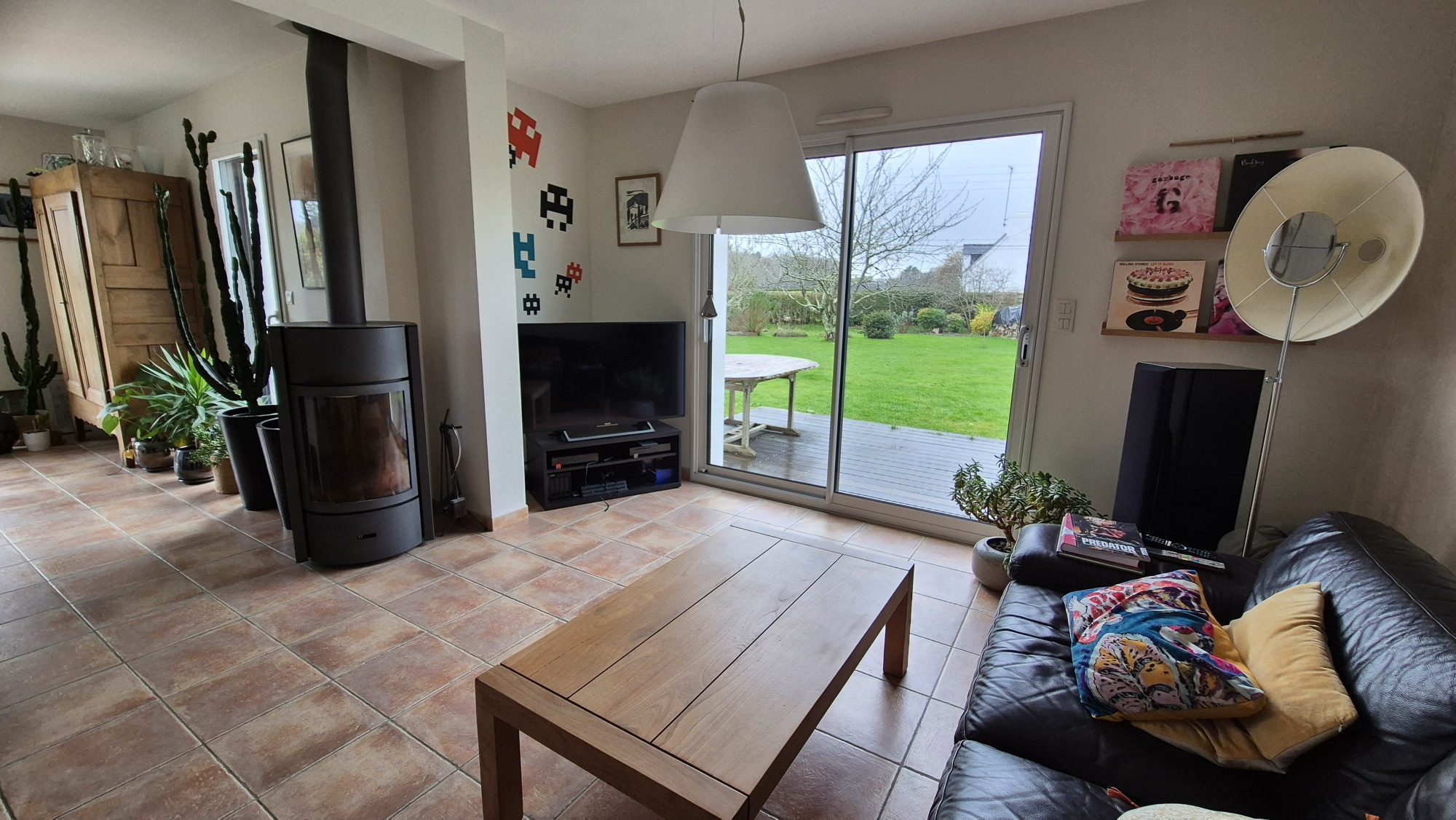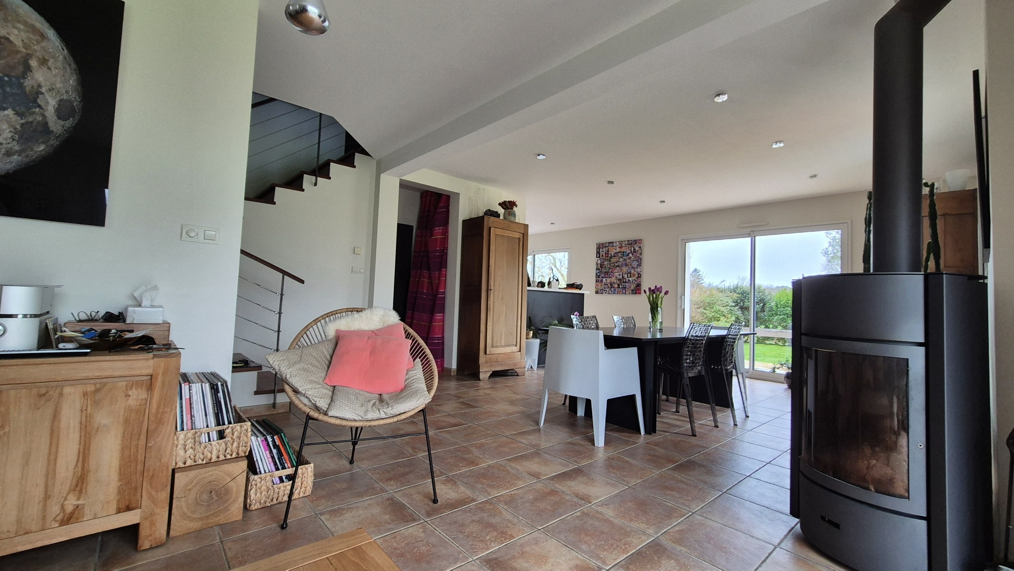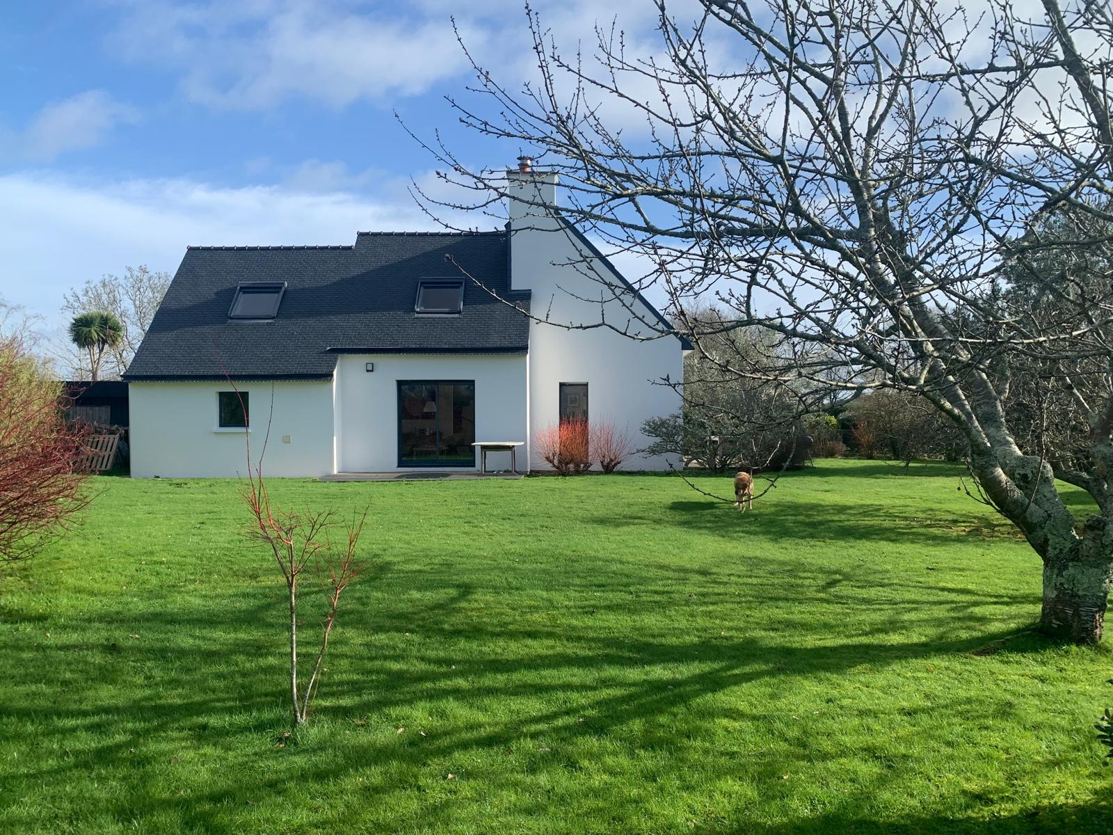 Dans un hameau à 3 km du bourg de MOËLAN et 5 km des plages, avec un accès rapide aux chemins de randonnée et de VTT, sise sur un terrain paysagé et arboré de 1165 m2, très agréable et lumineuse maison contemporaine de 5 pièces, construite en 2004, offrant : entrée sur une pièce à vivre de 50 m2 avec poêle à bois et partie cuisine ouverte aménagée, donnant accès sur deux terrasses en bois exotique et pierre, chambre (ou bureau) avec salle de douche privative, WC avec lave-mains.