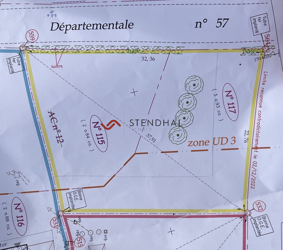 Belle parcelle de terrain plat située Route du Col de Clémencières à St Martin Le Vinoux. Superficie 691m2 composée de deux zones, l'une en UD4 et l'autre en UD3 (voir plan géomètre). Micro station à prévoir pour l'assainissement.