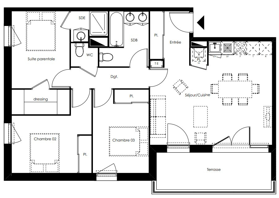 Dès l'entrée, vous profitez d'un placard intégré et d'un bel espace de vie de 27 m2 avec séjour et cuisine ouverte, prolongé par une terrasse exposée plein sud, idéale pour profiter des beaux jours.