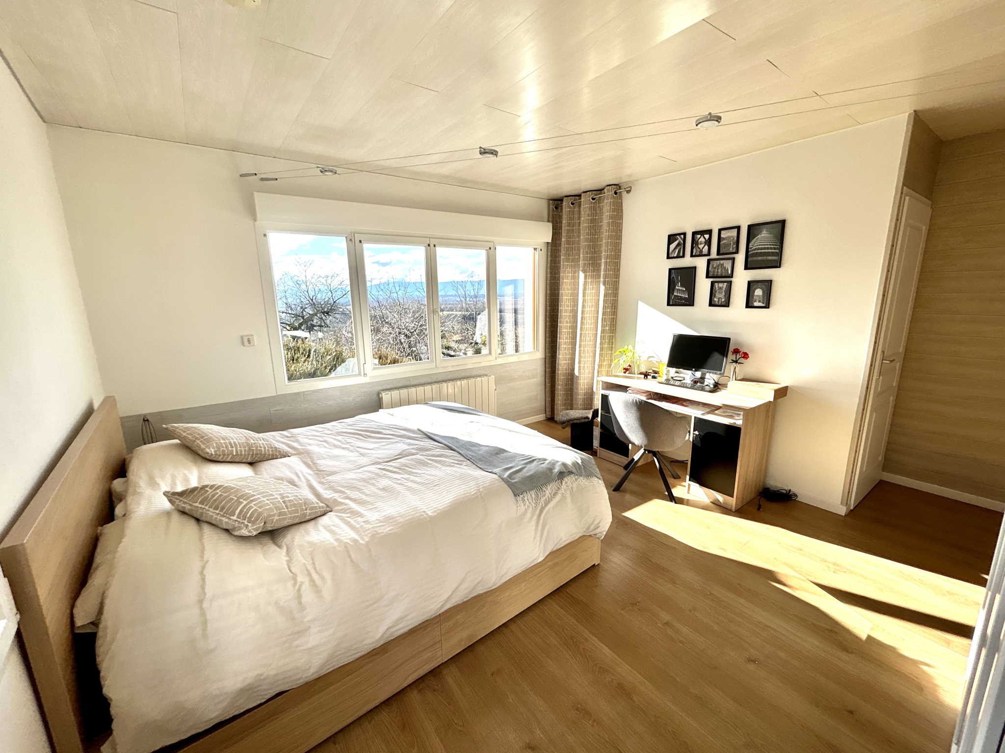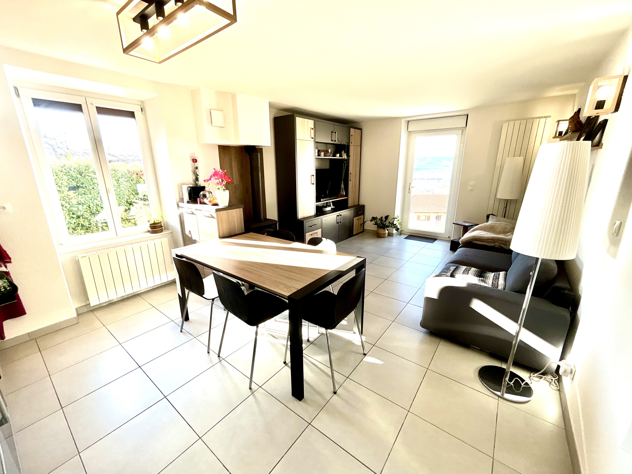 Au calme, belle maison de village rénovée avec goûts de 86 m2. Elle comprend une entrée, un espace de vie séjour cuisine donnant sur jardinet, salle de bains avec wc ainsi qu'un cellier. A l'étage, le coin nuit comprend deux chambres, mezzanine et wc séparé. Combles aménageables. Trois places de parking complètent ce bien. Jardin non attenant d'environ 500 m2, vue imprenable sur le lac.