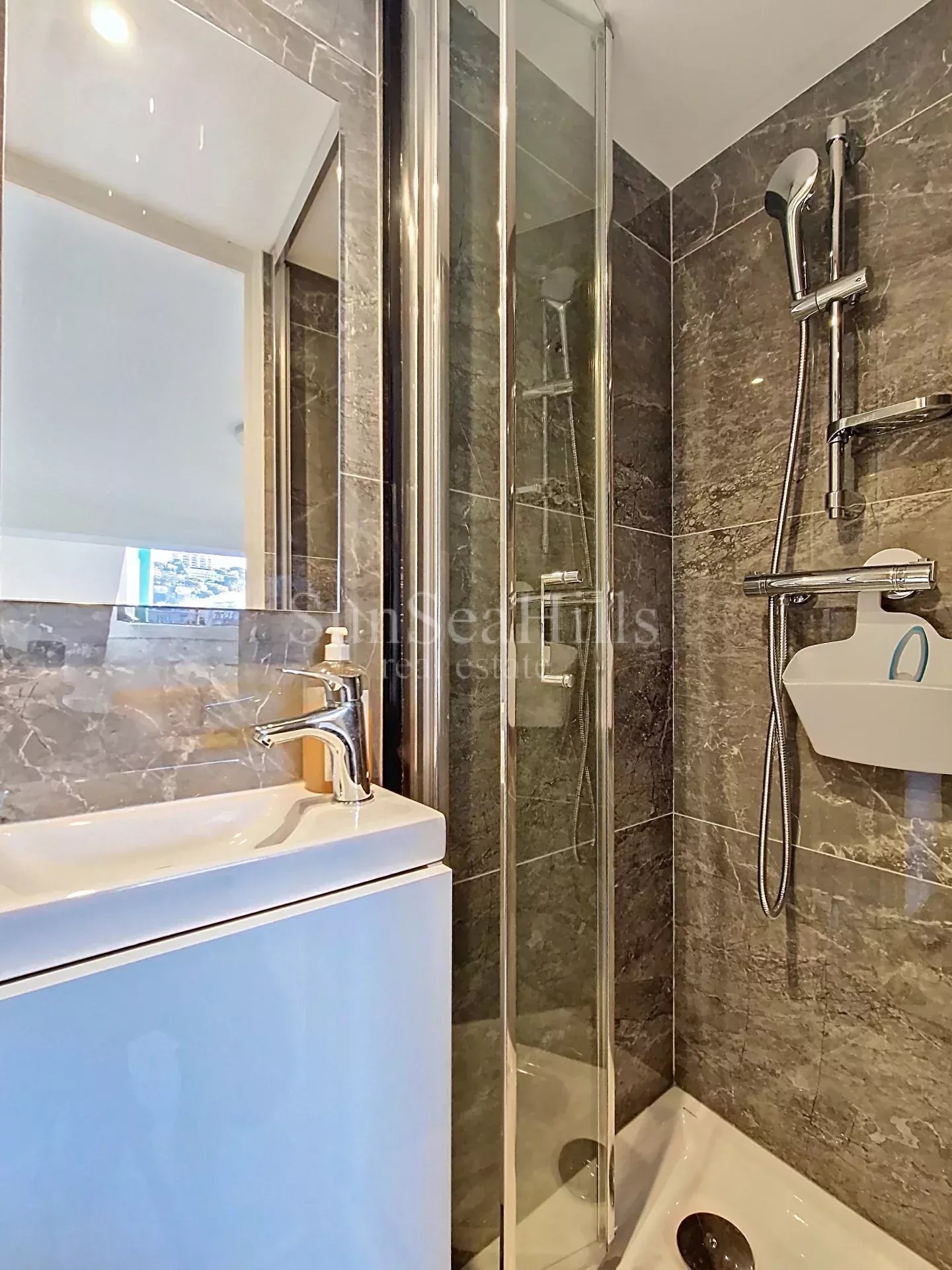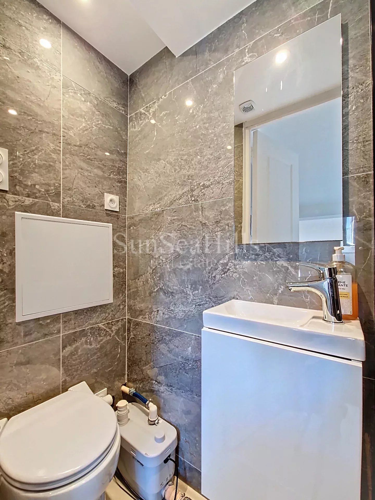 Une salle de douche contemporaine avec lave-mains et WC type sanibroyeur dont l’installation a été validée par la copropriété,