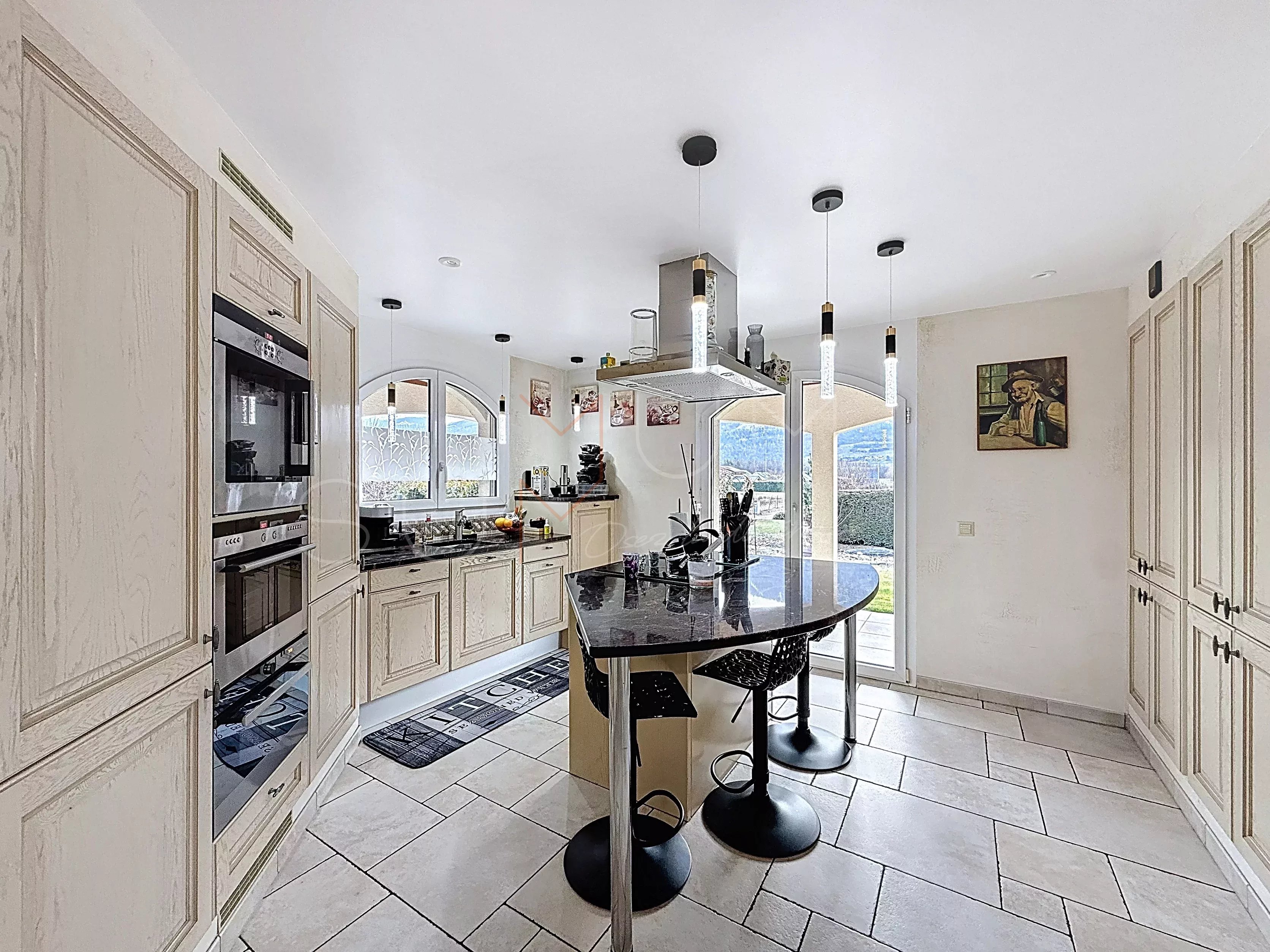 Cuisine séparée entièrement équipée : vitrocéramique, micro-ondes, steamer, îlot central