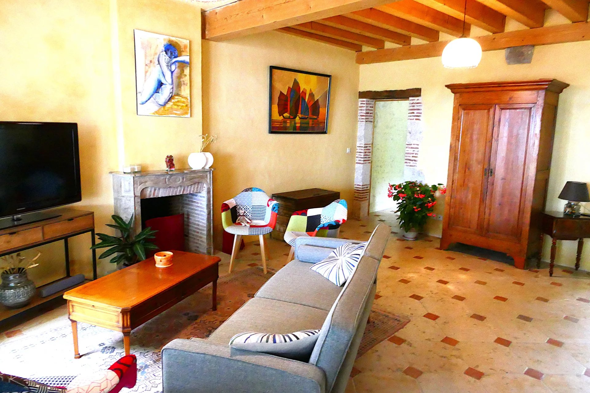 Ce bien offre au rez-de-chaussée un salon avec cheminée ouverte, une salle à manger, une cuisine aménagée et équipée, ainsi qu'un cellier et un wc. Au premier étage, vous trouverez une salle de bains avec toilettes et trois chambres, dont une avec vue sur la Loire.