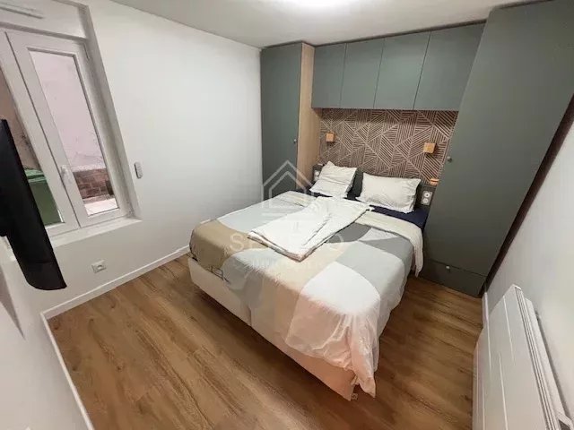 accès pièce principale donnant sur une cuisine ouverte équipée, une chambre, une salle d'eau avec toilette,