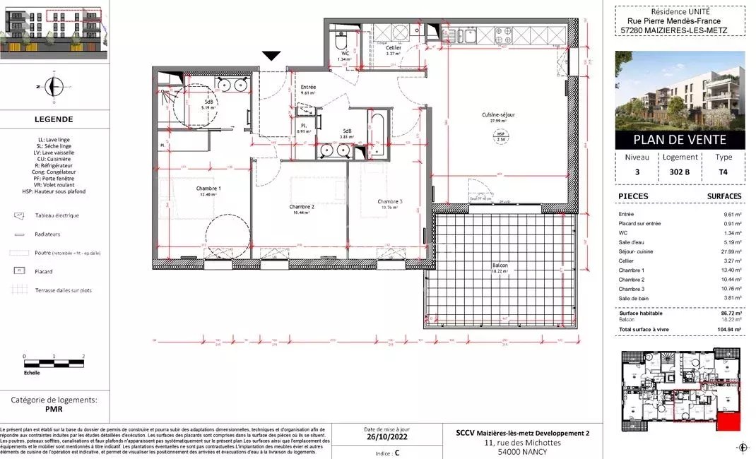 la croisée du centre-ville et de la vaste zone d’activités de Talange, réunissant de nombreuses enseignes, restaurants et grands magasins, la résidence Unité bénéficie d’une situation à la fois pratique et agréable. Implantée dans un quartier pavillonnaire paisible, au nord de Maizières-lès-Metz, elle offre à ses résidents un cadre de vie calme et intime, tout en restant proche des commodités. Dans un rayon de 650 mètres, on retrouve un supermarché Colruyt, une crèche, l’école maternelle Triolet, l’école primaire Rousseau ainsi que le collège Le Breuil, permettant un quotidien simple et confortable pour toute la famille. Le programme se compose de quatre bâtiments : les bâtiments A et B, comprenant chacun 12 appartements en accession (soit 24 au total), le bâtiment C, dédié à 23 logements en accession sociale, et le bâtiment D, regroupant 27 logements locatifs sociaux. L’appartement proposé, un T4, profite pleinement de cet environnement équilibré, combinant sérénité résidentielle et proximité urbaine.