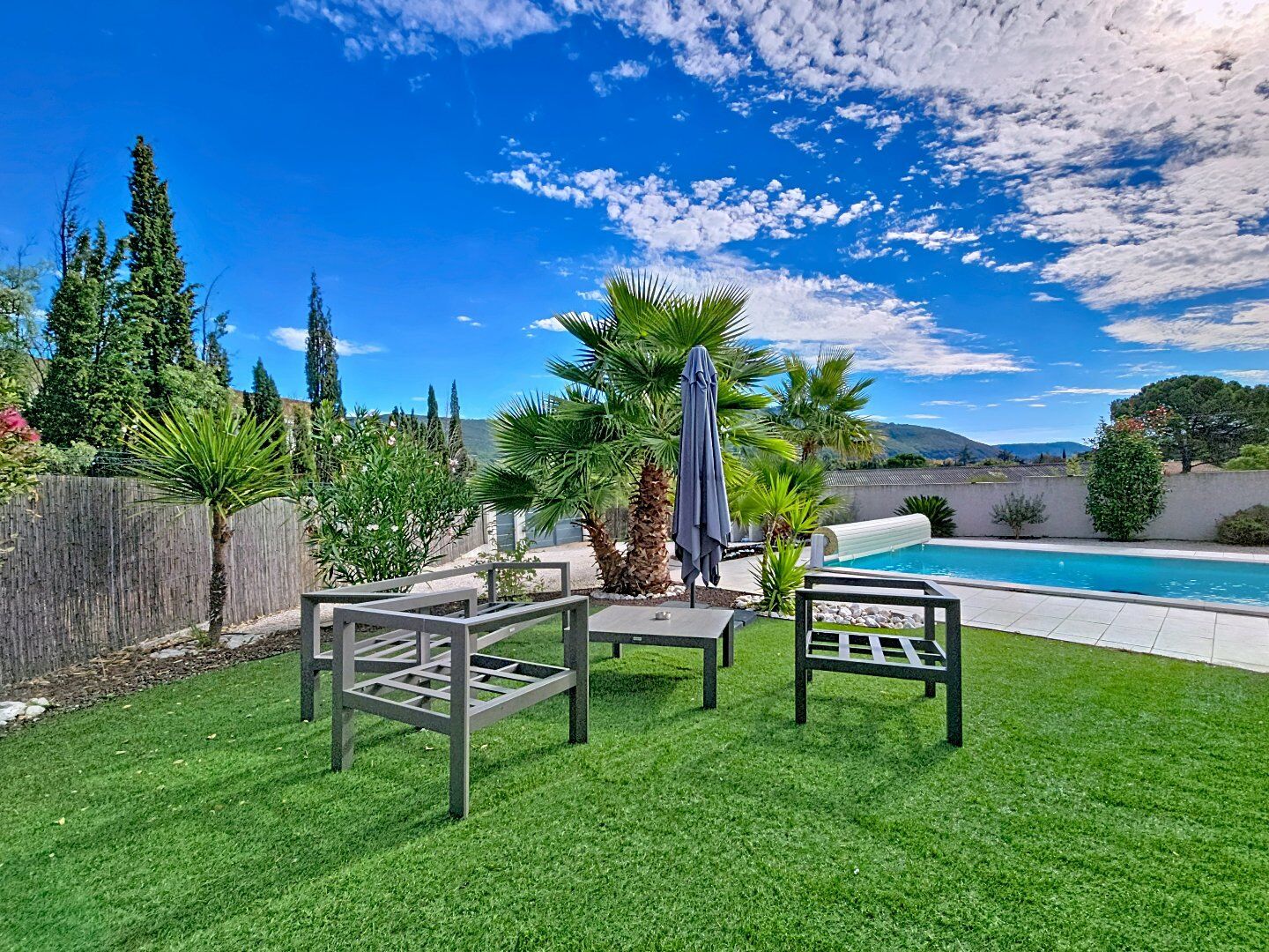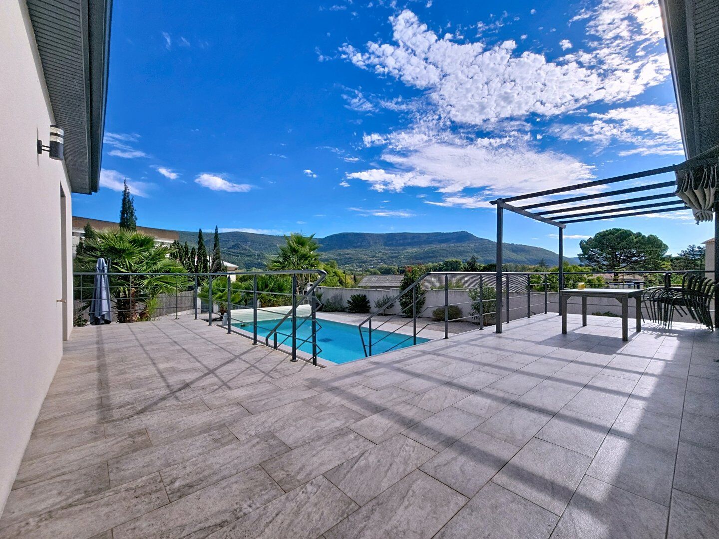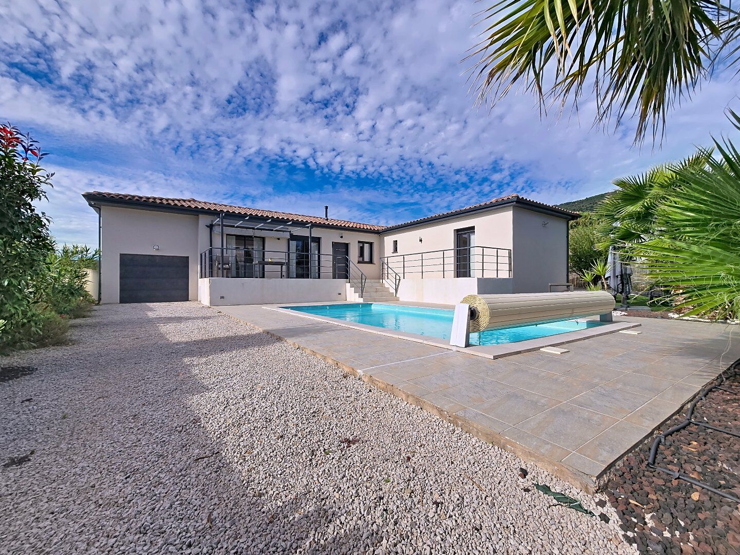 ), cette villa de plain-pied construite en 2018 offre un cadre de vie alliant confort, modernité et sérénité. D'une superficie habitable d'environ 137 m², elle s'ouvre sur une superbe pièce de vie de plus de 65 m² baignée de lumière, aux volumes généreux et aux finitions soignées. On y retrouve quatre chambres dont une spacieuse suite parentale avec accès direct à l'extérieur, une salle de bain élégante, ainsi qu'un garage carrelé et aménagé avec mezzanine et porte électrique apportant un espace fonctionnel supplémentaire. Implantée sur une parcelle de 1 030 m², la maison profite d'un extérieur avec terrasse de 45 m², pergola, piscine filtrée au sel de 8m x4m exposée plein sud. Laccès au jardin se fait par un portail électrique. Le jardin, facile d'entretien, est équipé d'un arrosage automatique et d'une végétation Méditerranéen (oliviers, palmier, laurier rose etc. ). Le tout dans un environnement paisible. Cette propriété convient parfaitement comme résidence principale ou éventuelle comme résidence secondaire avec des bonnes revenues locatives en perspective. Offre unique. Visite sur rendez-vous.