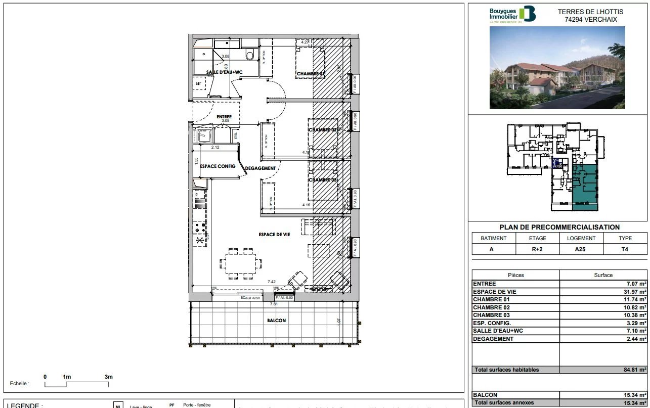 Appartement T4 de 84.32m² orienté Sud Est avec un balcon de 15.34m². Bénéficiez d'une belle pièce de vie de 31.97m², de trois chambres d'environ 10m² et d'une grande salle d'eau avec WC. Découvrez également un espace à configurer de plus de 3m². Découvrez "Terres de Lhottis", une résidence d'exception nichée dans un cadre montagnard préservé, où le confort moderne rencontre l'authenticité de l'architecture alpine.Conçue avec soin pour s'intégrer harmonieusement dans son environnement, la résidence arbore des bardages et aiguilles en bois sur ses façades, rappelant le charme traditionnel des chalets alpins.Située sur le versant sud de la vallée du Haut-Giffre, la résidence bénéficie d'un ensoleillement optimal tout au long de l'année, créant des intérieurs lumineux et chaleureux baignés de lumière naturelle.Enfin, pour agrémenter votre quotidien, un espace commun avec jeux ainsi qu'un garage à vélos sont mis à disposition au sein de la résidence, pour le plus grand bonheur de ses résidents. Ne manquez pas l'opportunité de vivre dans ce havre de paix montagnard, alliant confort, modernité et tradition