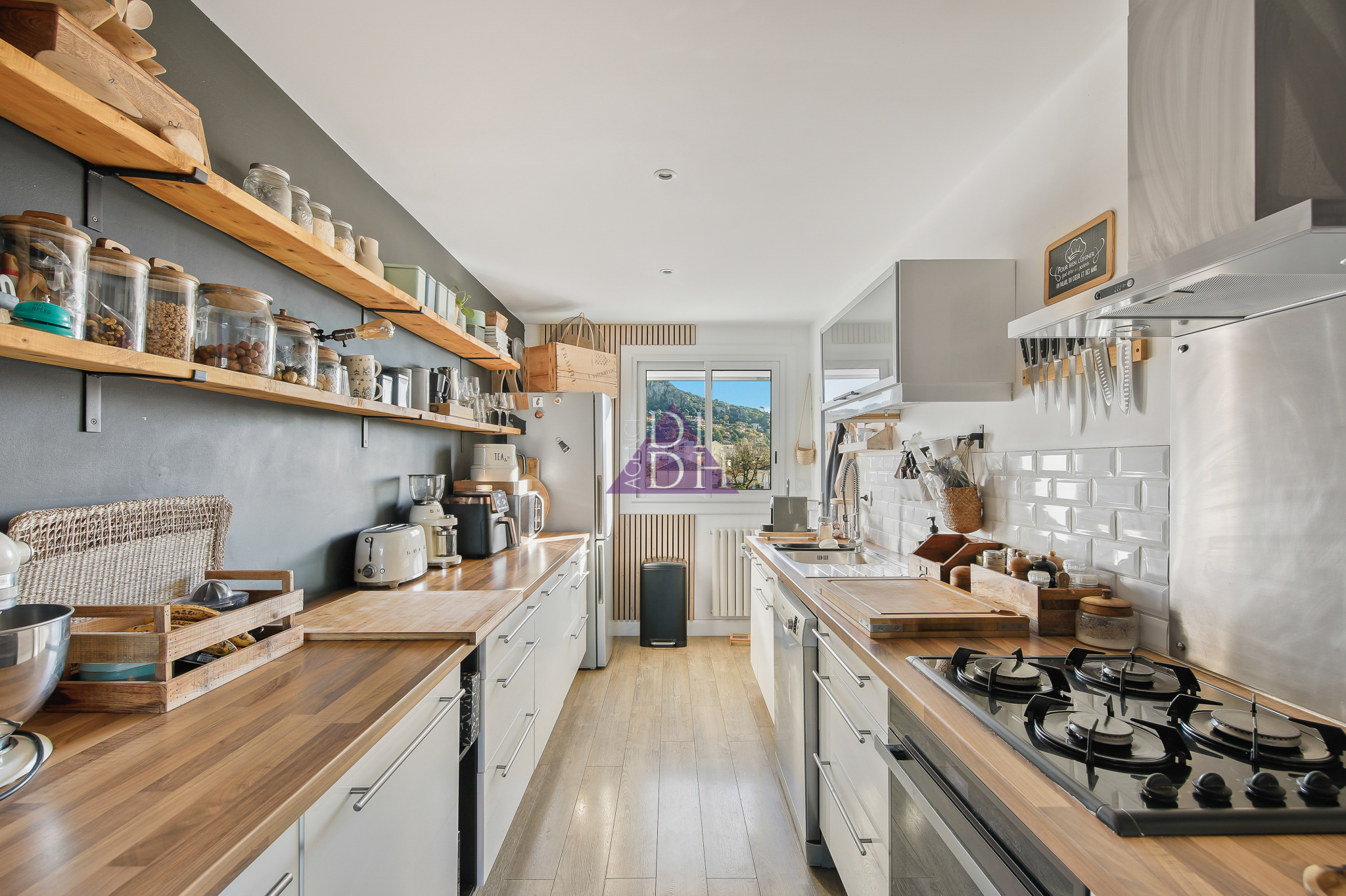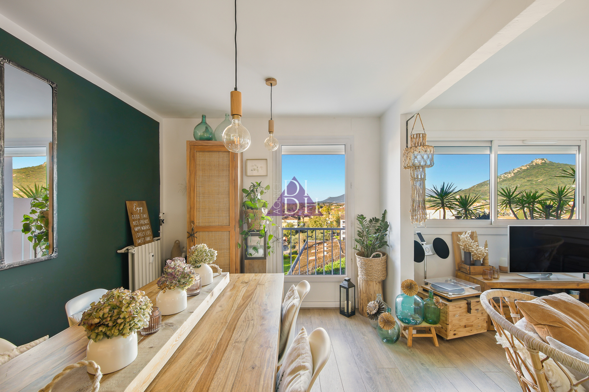 HYERES OUEST à 5 minutes en voiture du centre ville et au calme, d'une surface de plus de 95m2, cet appartement en dernier étage ( avec ascenseur) et climatisé se compose d'une entrée, d'un séjour de plus de 30m2 ouvrant sur balcon de 5m2 exposé ouest, d'une cuisine aménagée complétée d'une loggia accueillant buanderie et espace de rangement, d'un dégagement avec placards, de 3 chambres dont une avec son dressing, d'un second dressing, d'une salle d'eau et d'un WC indépendant. Vous serez séduits par son parfait état, sa décoration soignée et tendance, sa situation en dernier étage, ses superbes vues dégagées de toutes les pièces : collines et ile de Porquerolles et sa luminosité. Un garage complète l'ensemble. Le bien est situé dans une résidence sécurisée et fermée disposant d'un local à vélo, d'un large parking collectif; un ravalement avec isolation thermique des murs par l'extérieur vient d'être réalisé afin de répondre aux enjeux environnementaux actuels.