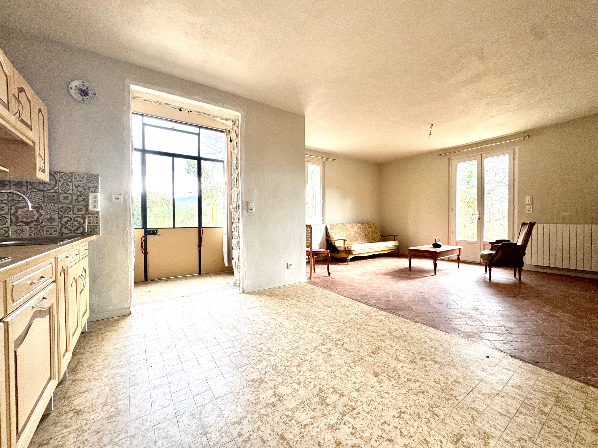 Rez-de-chaussée : - Entrée, - Séjour / cuisine ouverte, - Salon, - WC indépendant, - Salle de bain / douche, - Deux chambres.