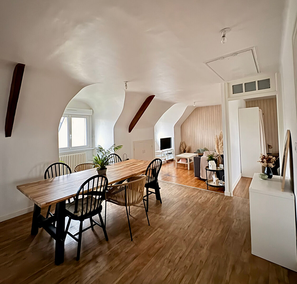 QUIMPER - Kerfeunteun Appartement T3 de 68 m², au deuxième étage d'un immeuble de trois appartements, comprenant une grande pièce de vie avec coin cuisine aménagée et équipée (plaques, hotte), deux chambres, une salle de bain avec WC. Disponible dès maintenant Loyer : 550 euros Provisions sur charges : 150 euros (eau, gaz, entretien des communs, entretien jardin, entretien chaudière) Dépôt de garantie : 550 euros Honoraires locataire : 748 euros (dont 204 euros pour l'état des lieux). Les informations sur les risques auxquels ce bien est exposé sont disponibles sur le site Géorisques : www.georisques.gouv.fr.