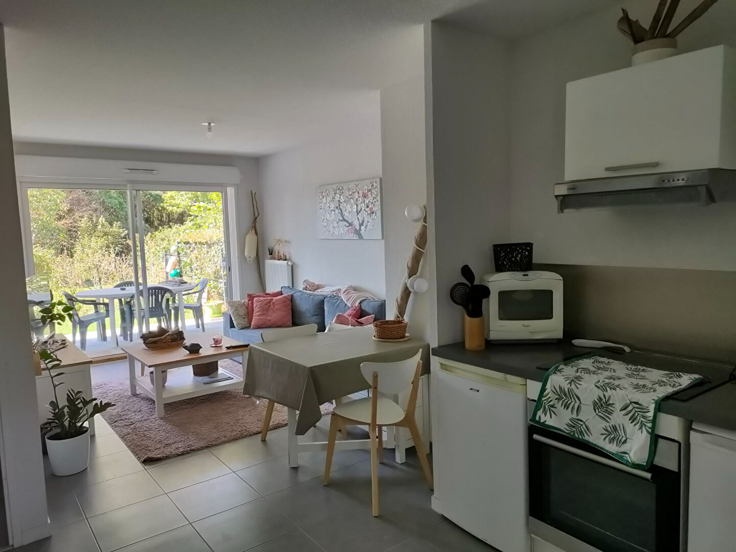 Situé dans une impasse au calme, à proximité immédiate du centre-ville et des commerces, au sein d'une résidence récente et sécurisée, venez découvrir ce superbe T2 en rez-de-jardin. Il se compose d'un agréable séjour avec cuisine américaine entièrement équipée, ouvrant sur une terrasse couverte et un espace extérieur, d'une chambre confortable, ainsi que d'une salle d'eau avec WC. Chauffage central, belles prestations et deux places de parking complètent ce bien. Appartement vendu avec un locataire en place. Copropriété de 80 lots - dont 22 lots habitation.(Pas de procédure en cours).