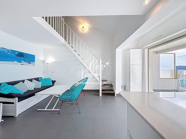 CAVALIERE PIEDS DANS L EAU EXCLUSIVITE DANS VOTRE AGENCE CAP NEGRE bel appartement en résidence pieds dans l'eau avec terrasse, vue mer et accès direct à la plage. L'espace de vie se compose d'un séjour lumineux avec cuisine ouverte tte équipée, donnant sur la terrasse de 8 m² offrant une vue panoramique sur la mer, le Cap Nègre et les îles. Une mezzanine aménagée de 9m², accueille une chambre ainsi qu'un coin nuit en + de 4.7m². Une salle d'eau wc complète l'ensemble. Accès direct à la plage, proximité immédiate de commerces, restaurants, et services.Classe énergie : C 550 000 euros (5.00 % honoraires TTC à la charge de l'acquéreur.)