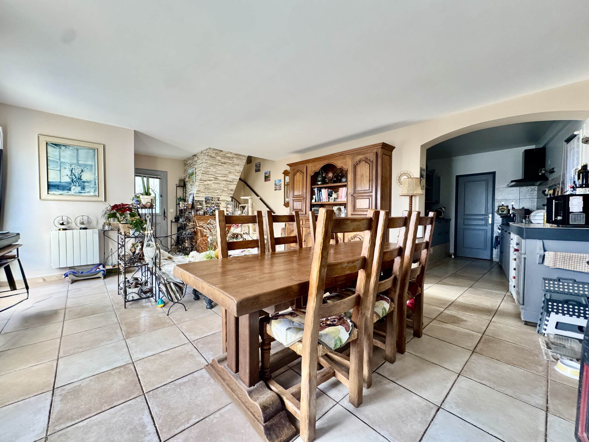 Dès l'entrée, au rez-de-chaussée, vous découvrirez une belle pièce de vie chaleureuse et lumineuse. La cuisine séparée ouverte s'intègre harmonieusement au salon, créant un espace convivial idéal pour partager des moments en famille ou entre amis. Cet espace de vie bénéficie d'une bonne luminosité naturelle et permet un aménagement facile selon vos envies.