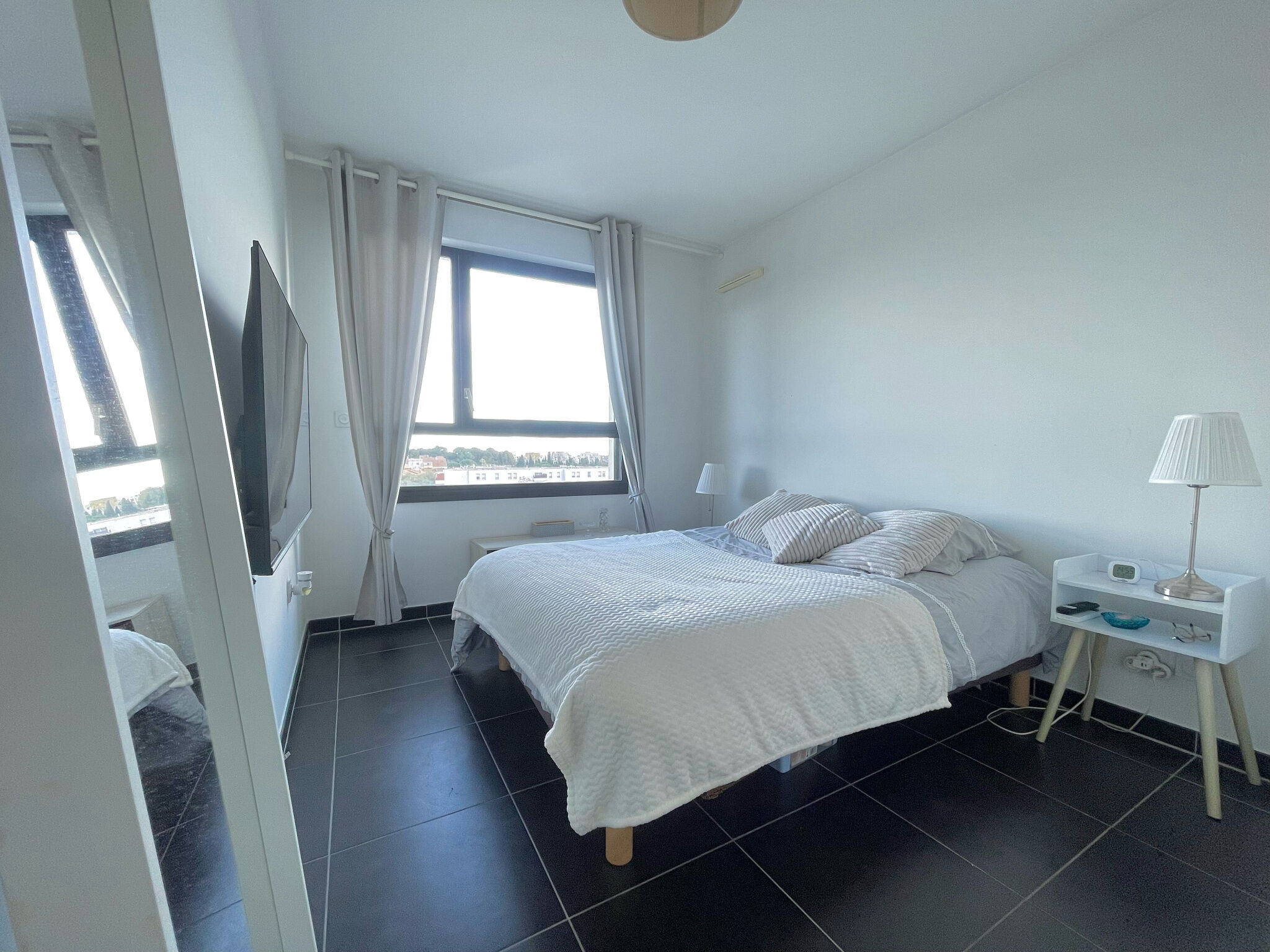 Situé en étage élevé avec ascenseur, cet appartement lumineux dispose d'une belle terrasse exposée plein sud, accessible du salon mais aussi directement depuis l'une des deux chambres. Vous profiterez d'un séjour spacieux, de deux chambres confortables, d'une cuisine haut de gamme entièrement équipée, ainsi que d'un coin buanderie.