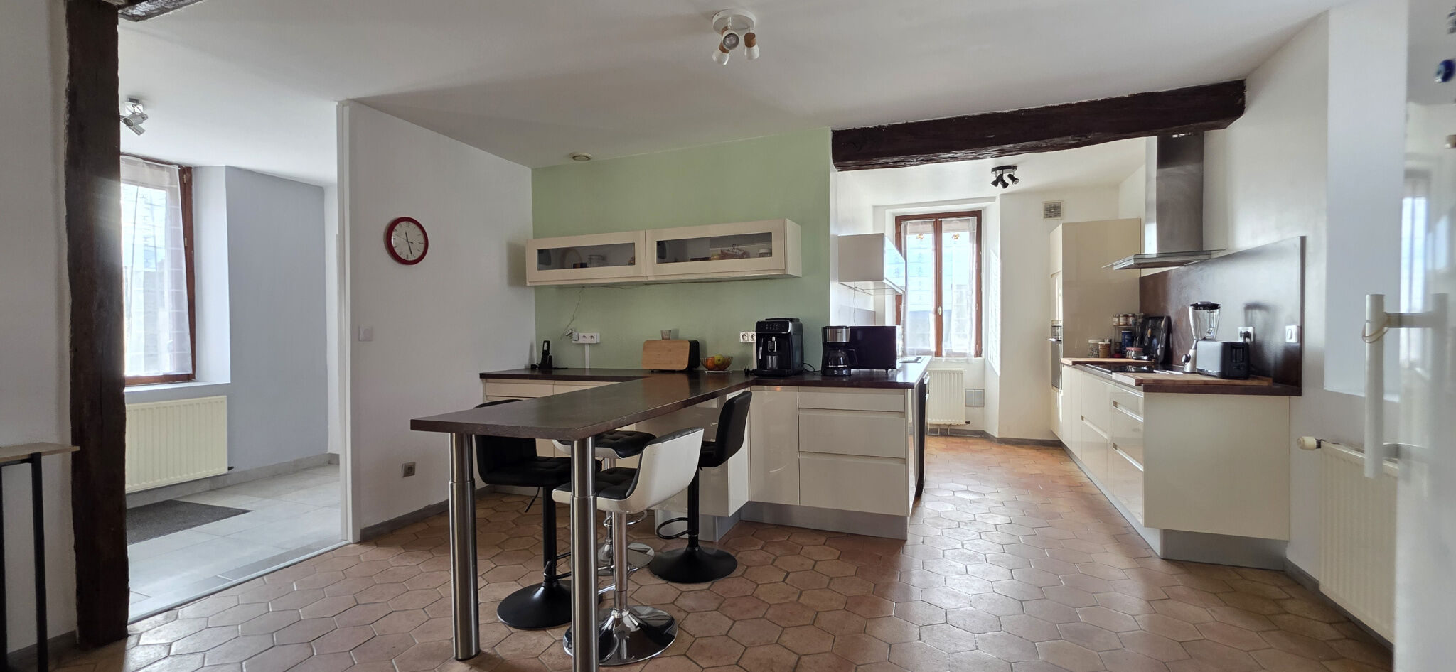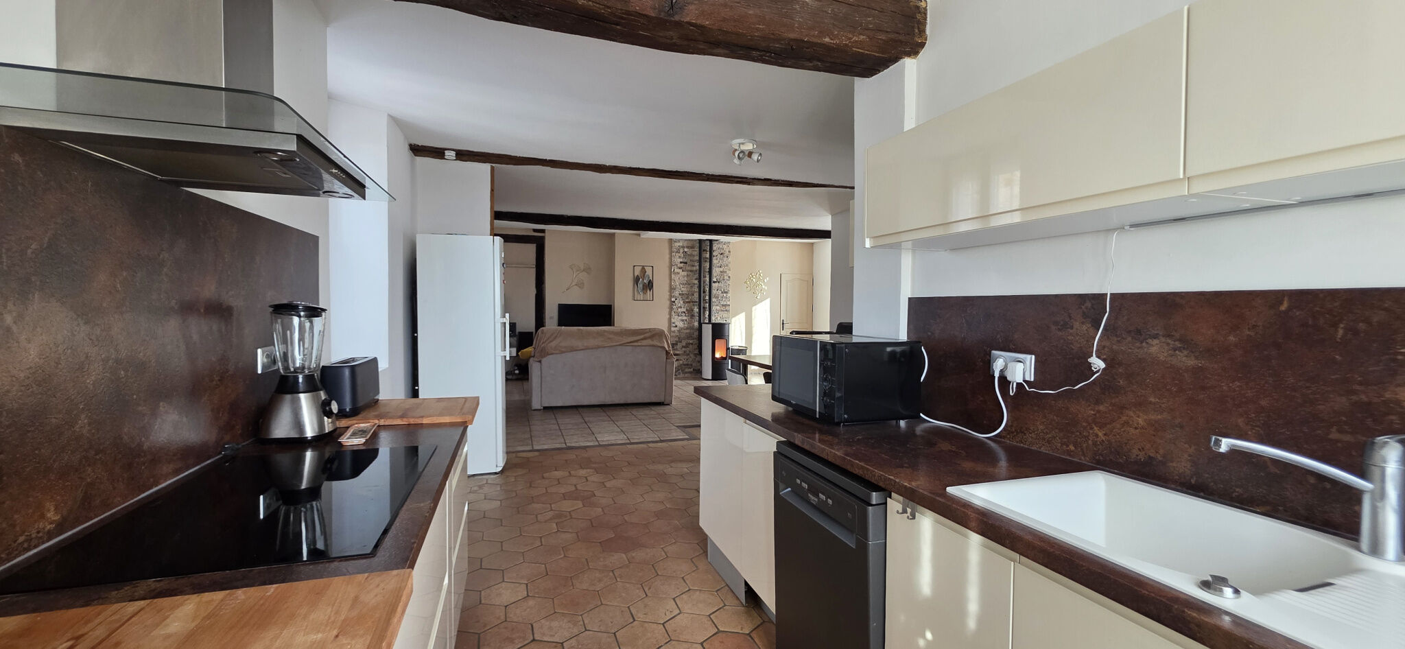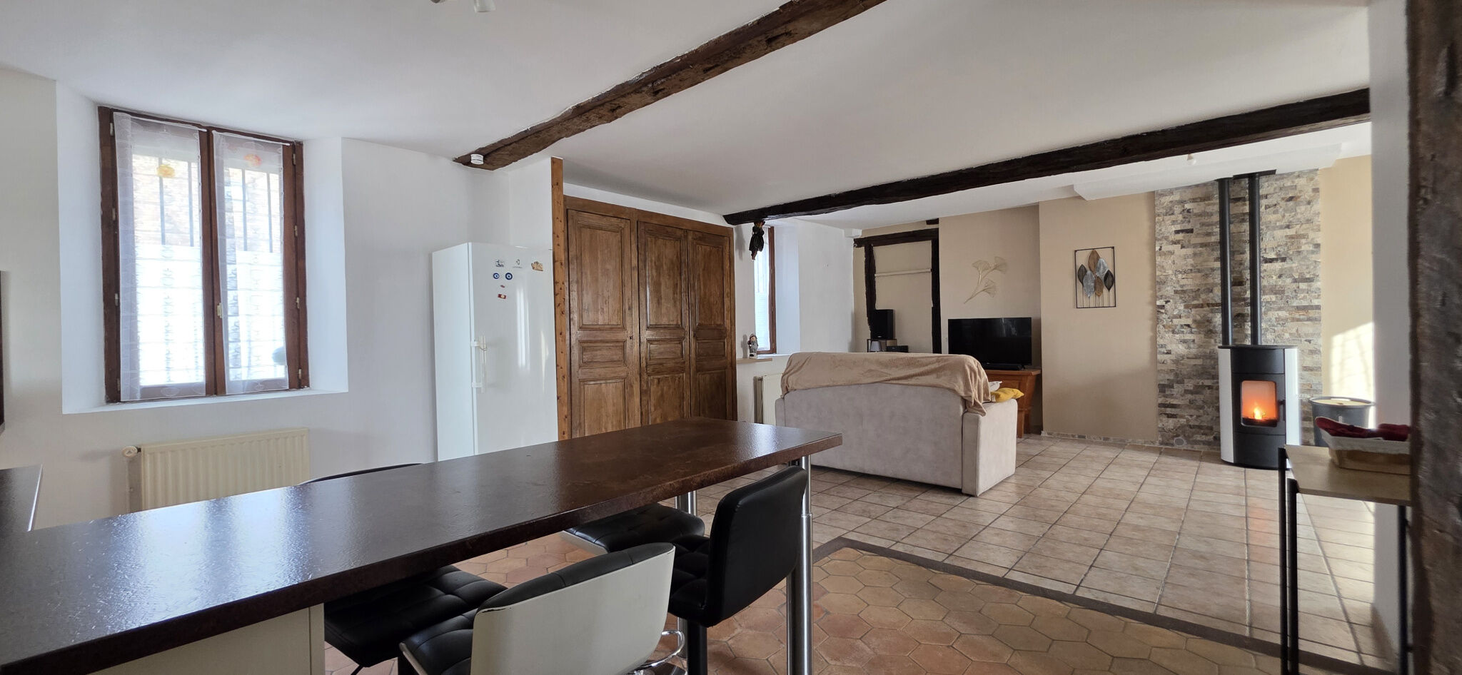 Vous découvrirez une entrée d'environ 8 m² ouvrant sur une vaste cuisine dînatoire d'environ 21 m² aménagée et équipée (hotte, plaque à induction, four et lave-vaisselle tous les trois de 2022), prolongée par un double séjour traversant d'environ 33 m² avec poêle à granulés de 2022. L'ensemble offre une belle pièce de vie d'environ 54 m². Une chambre de plain-pied d'environ 25 m², au charme de l'ancien avec poutres et mangeoire d'origine, complète ce niveau, ainsi qu'une salle d'eau et un WC accessibles depuis un dégagement.