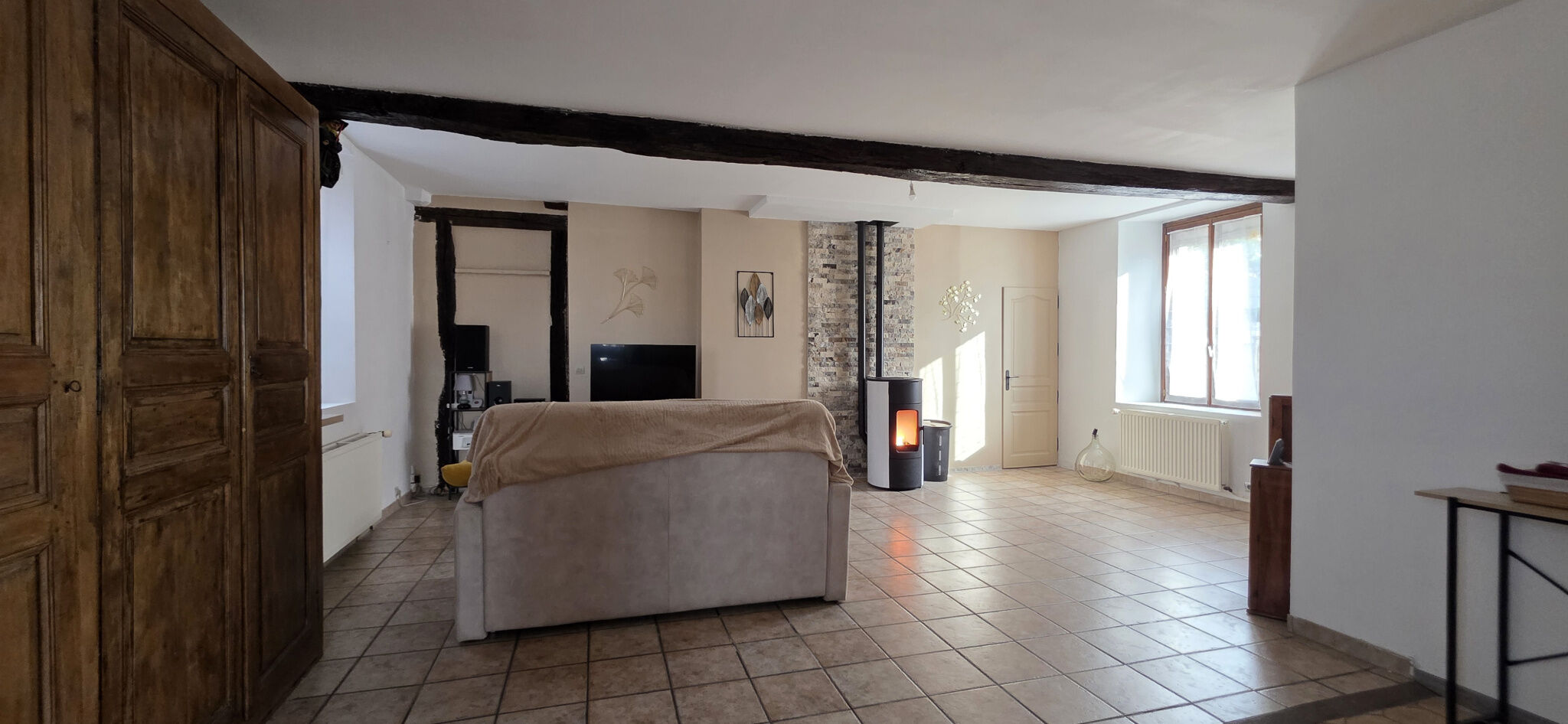 À l'étage, un palier d'environ 15 m² habitables, idéal en bureau ou espace détente, distribue trois chambres d'environ 11 m², 12 m² et 19 m² habitables. Deux d'entre elles sont équipées de répartiteurs de chaleur reliés au poêle à granulés. L'étage comprend également une salle d'eau avec WC, et peut être raccordé au chauffage central existant. Vous apprécierez les belles hauteurs sous plafond et les fermes apparentes. La chambre du fond peut être cloisonnée pour prolonger le couloir et desservir de futures pièces dans le grenier d'environ 52 m² au sol, situé au-dessus de l'atelier.