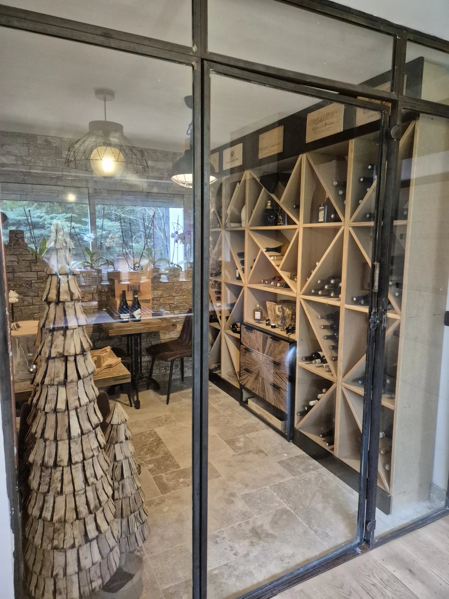 - Au rez-de-chaussée : salon-séjour-cuisine (72.65m²) avec cheminée insert bois, cuisine arrière (7.15m²), deux chambres (12.85 – 23.10m²), cave à vin aménagée (5.80m²), dégagements (3.00m²), wc (1.20m²) ;