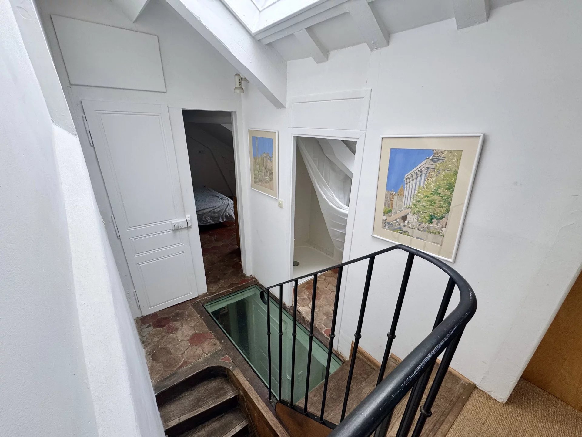 Le duplex bénéficie d'une triple exposition nord, sud et ouest. Un plancher vitré entre les deux niveaux crée un puits de lumière et sublime la luminosité de l’ensemble. Un lieu atypique et plein de cachet, conjuguant charme, caractère et volumes singuliers.