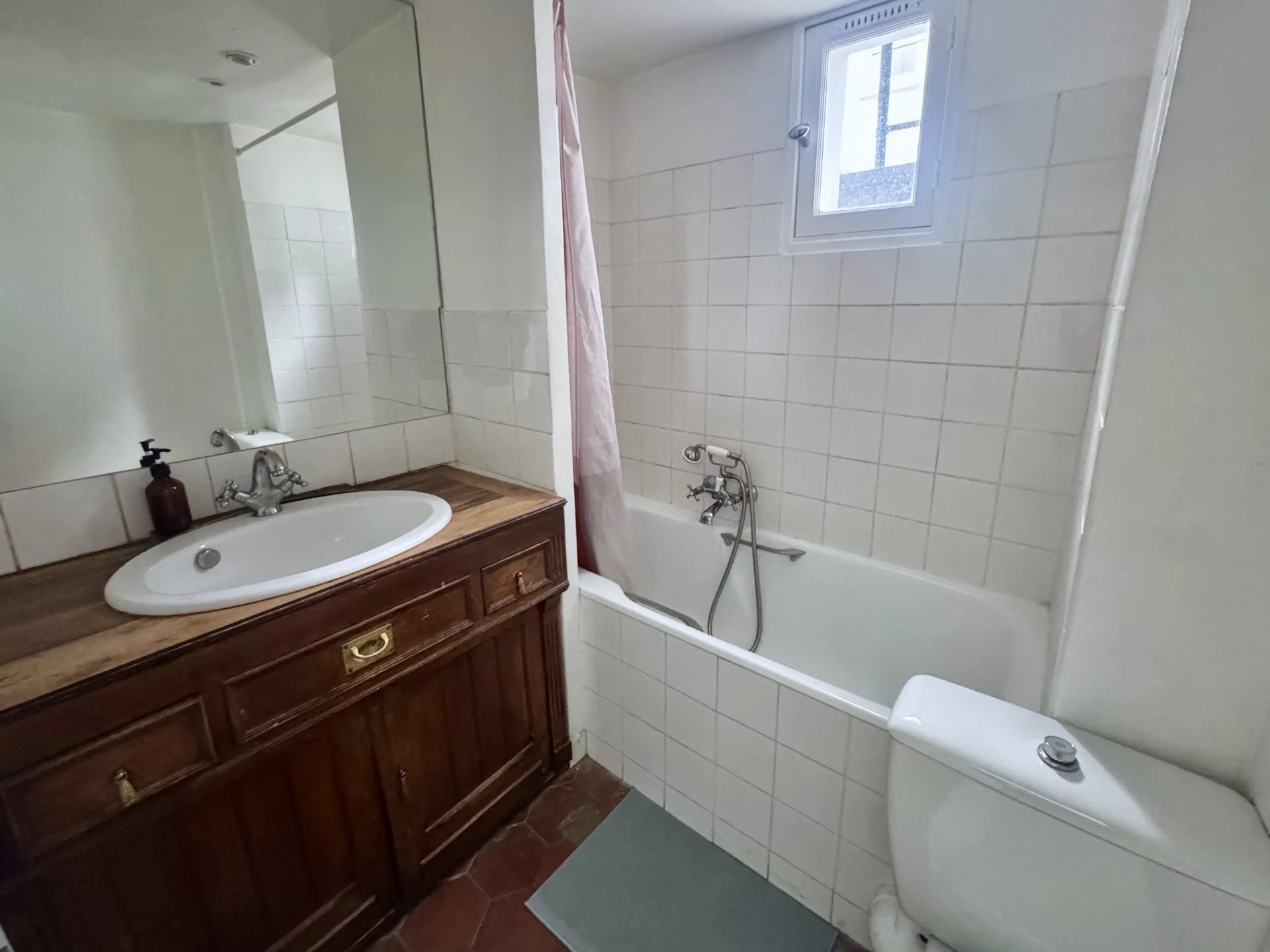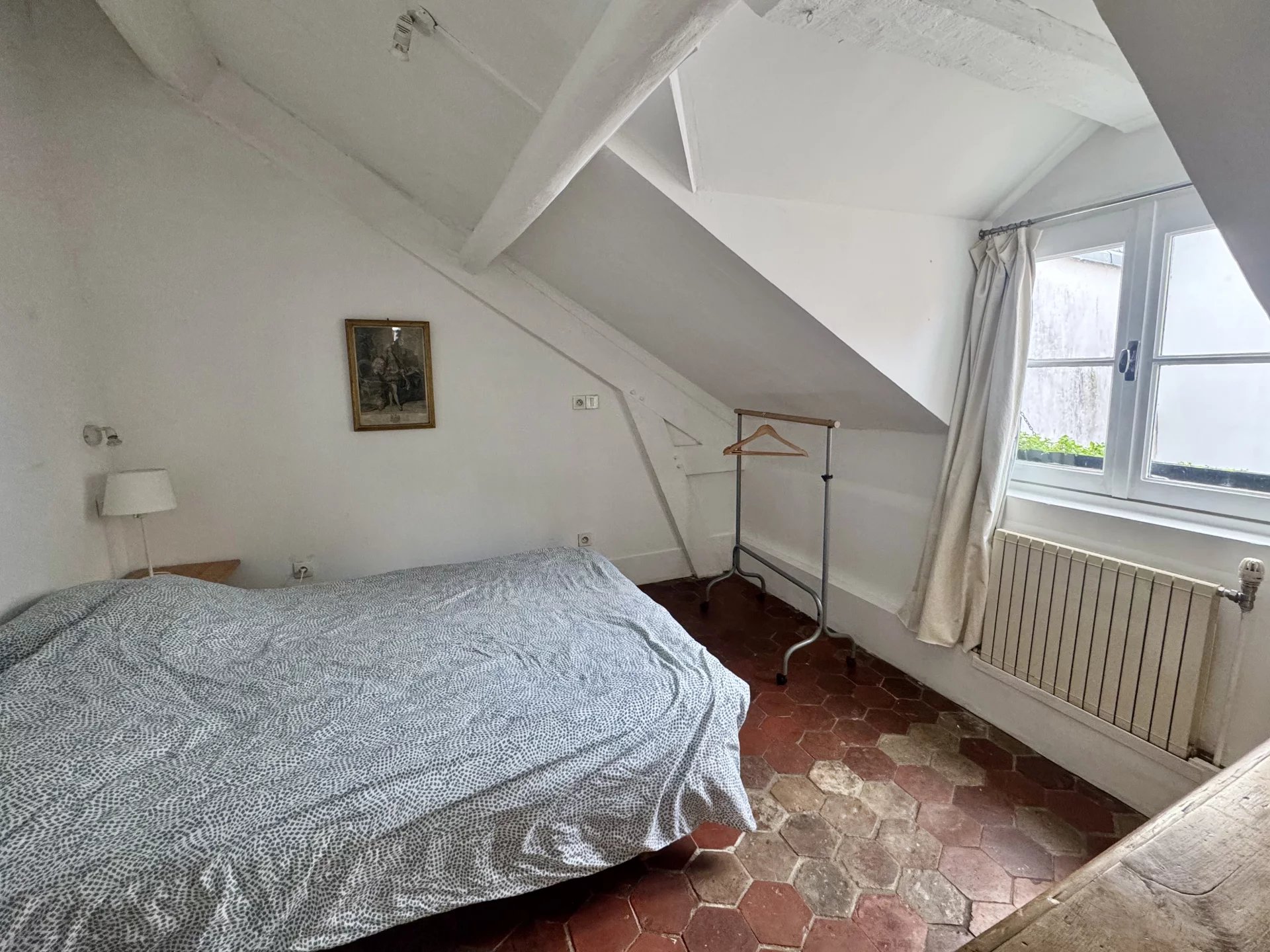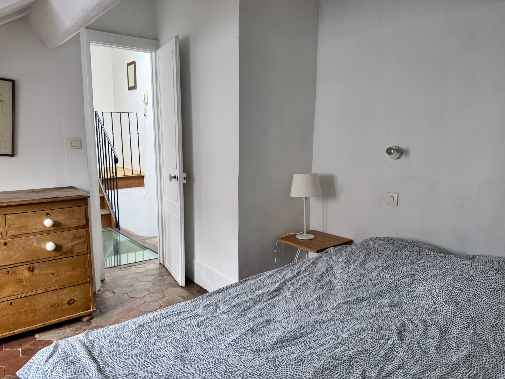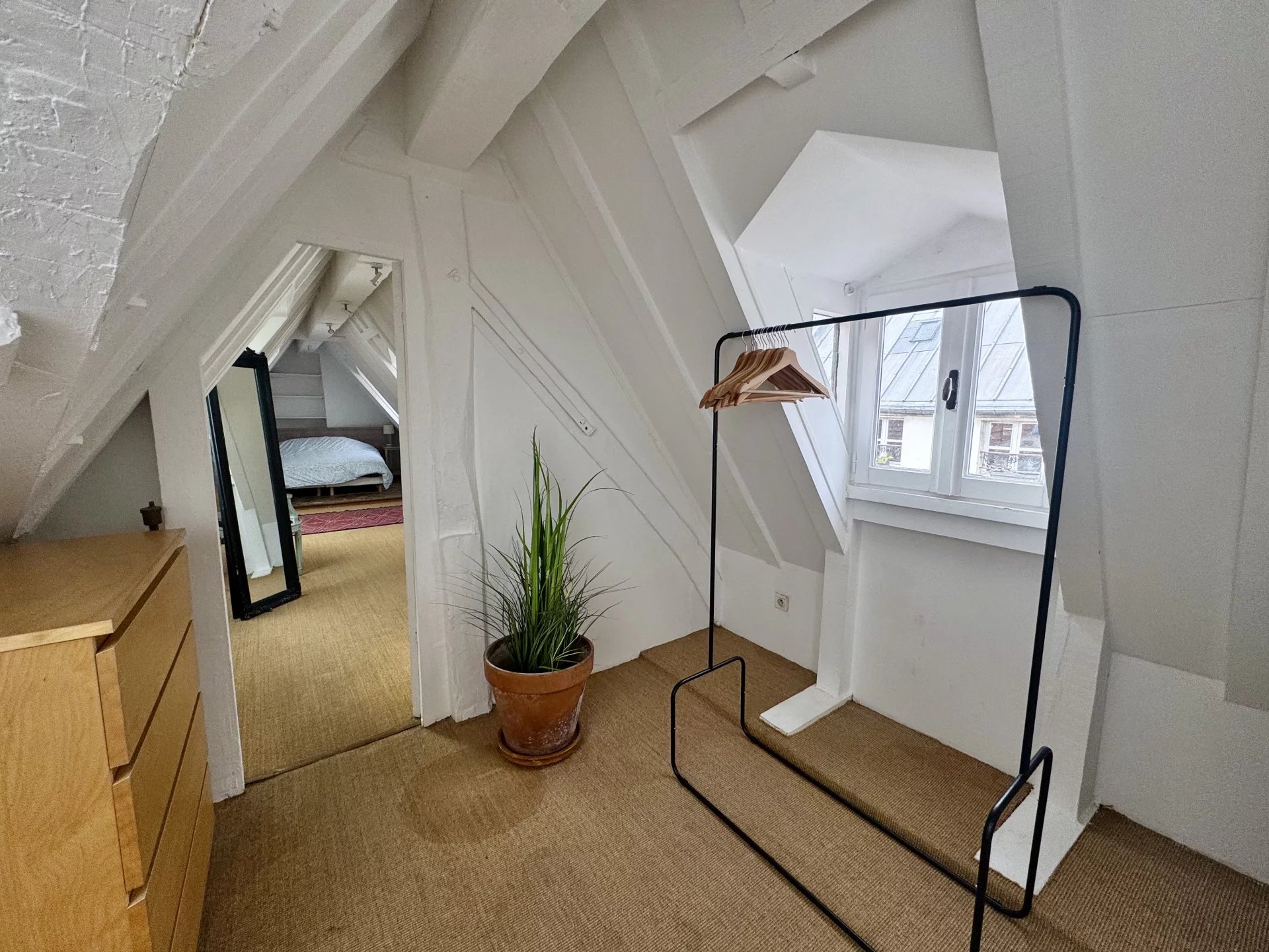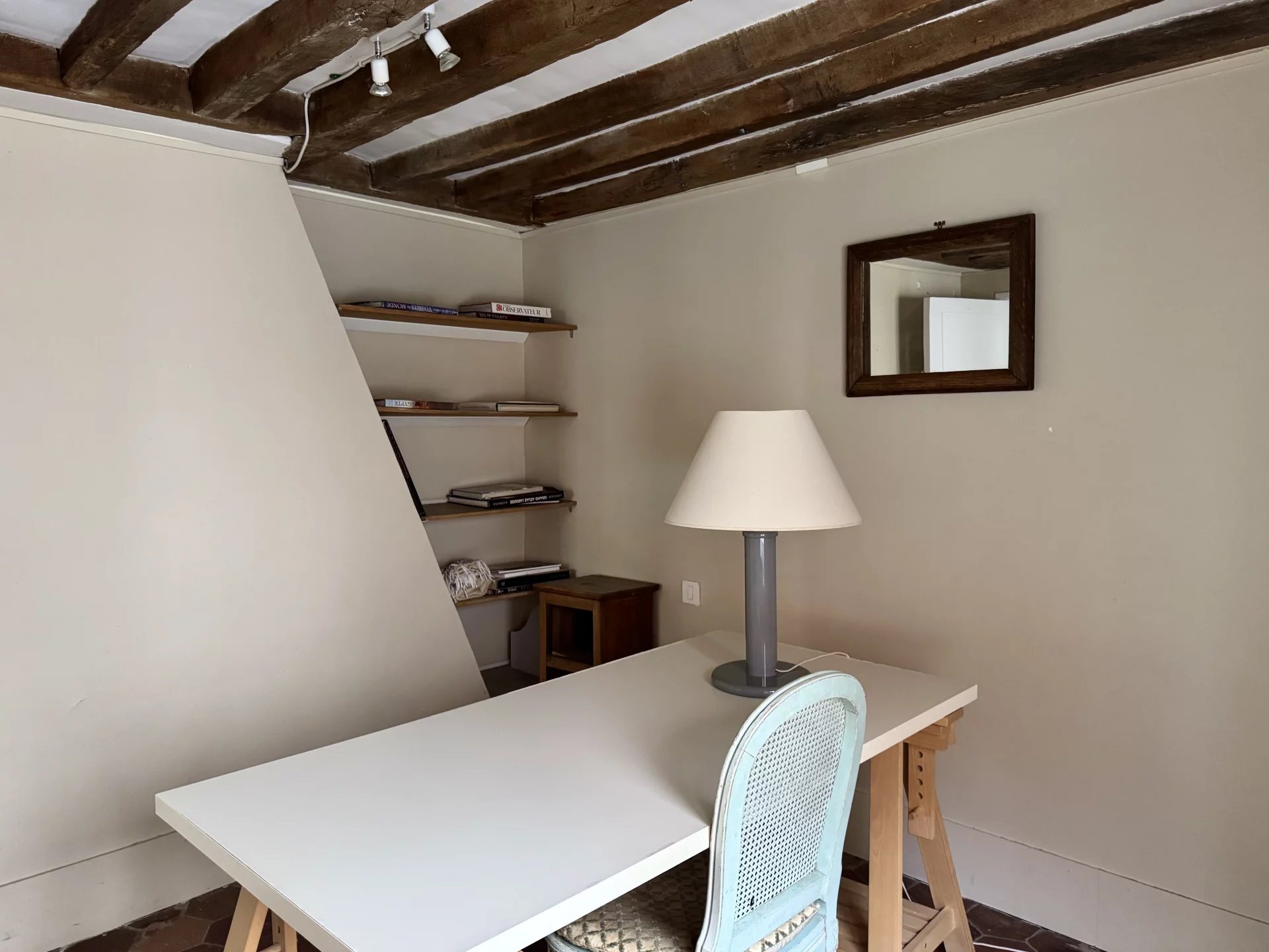 Au niveau inférieur, l'appartement se compose d'un séjour lumineux avec cuisine ouverte et cheminée fonctionnelle, d'une salle de bain avec WC, et d'une chambre ou bureau avec poutre apparentes.