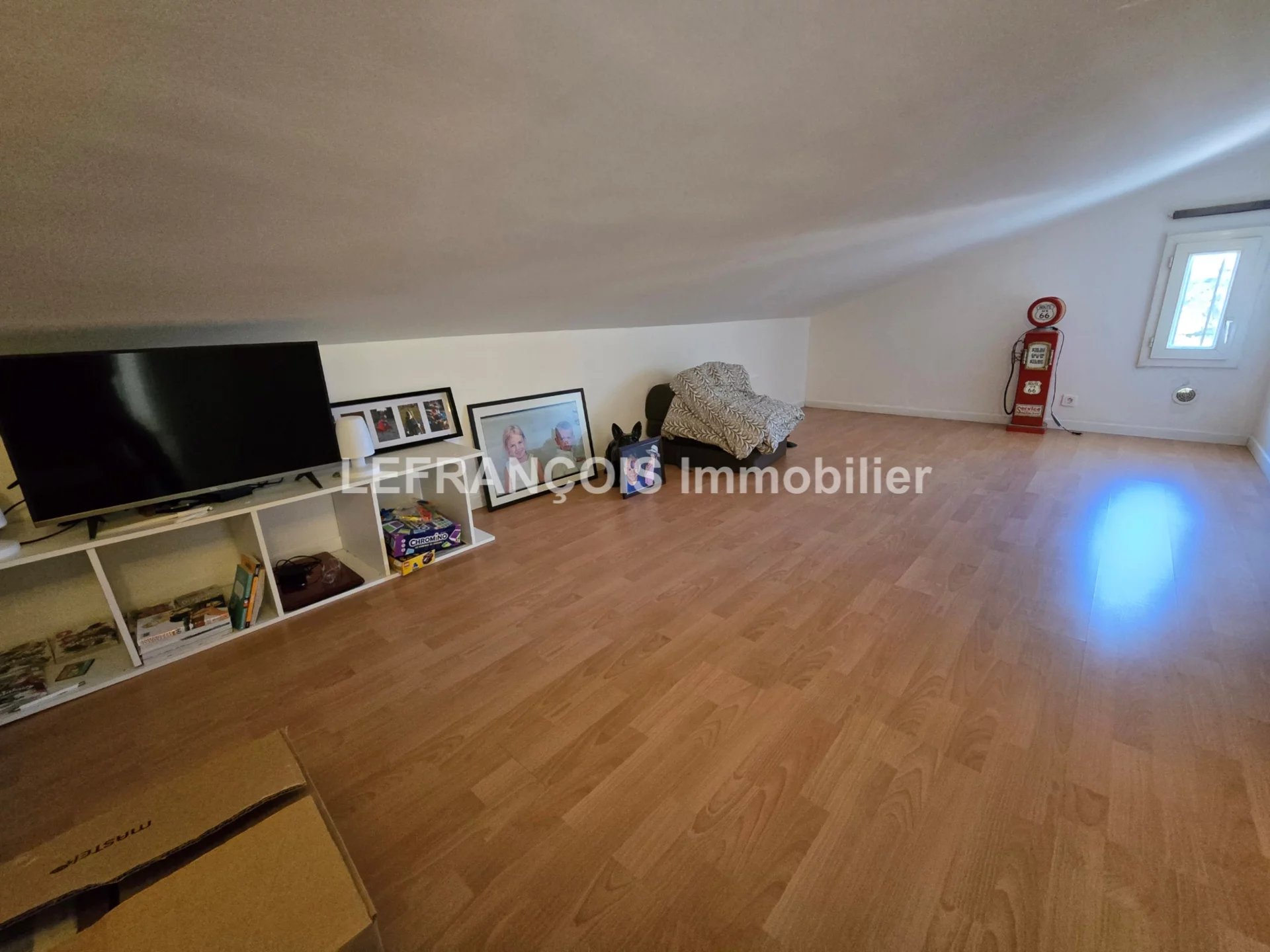À l'étage : 2 vastes chambres mansardées, une salle de jeux et un espace de stockage.