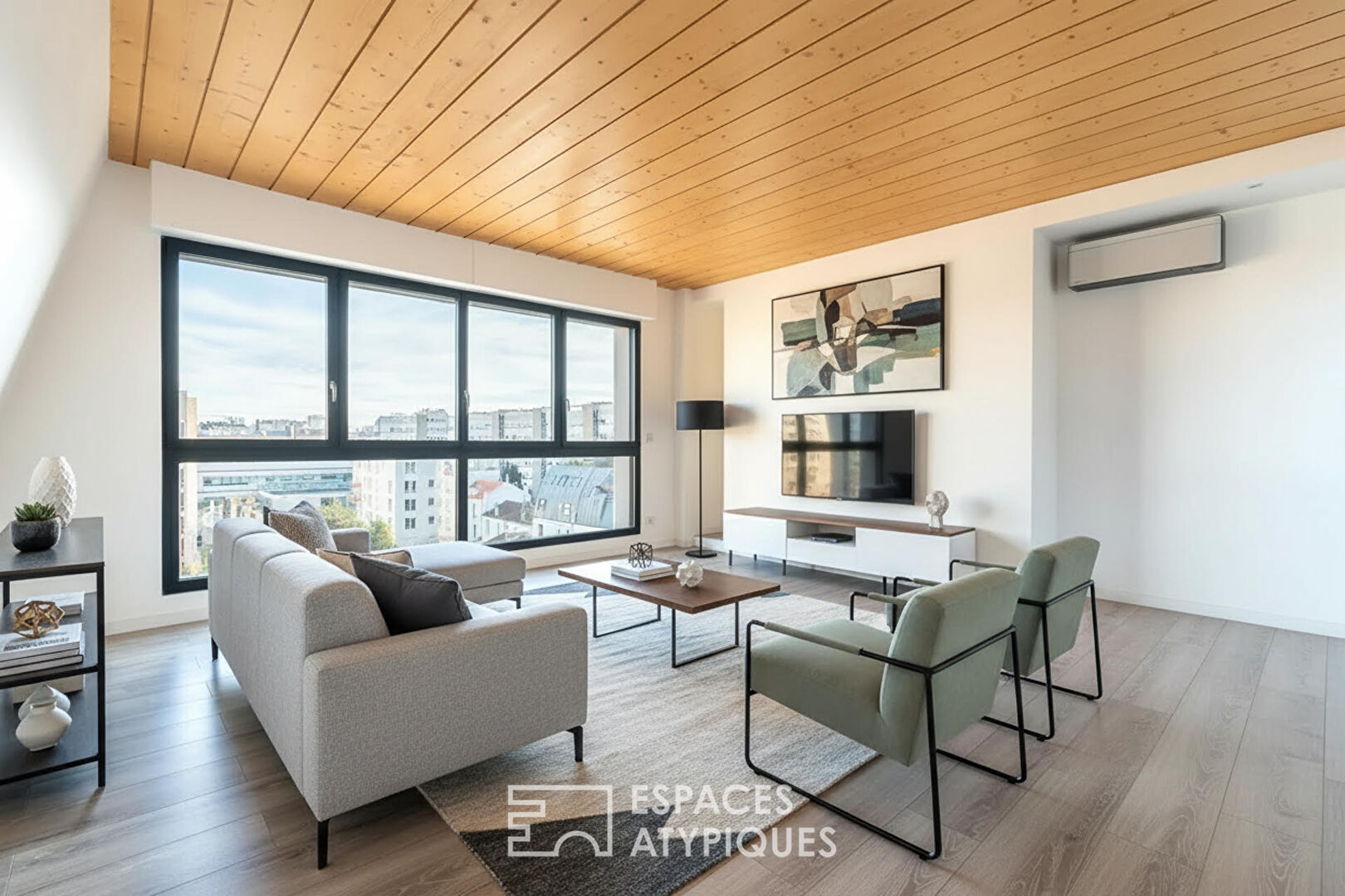 Au coeur d'une rue particulièrement calme du centre de Boulogne-Billancourt, à deux pas de la mairie, se cache un penthouse confidentiel occupant les deux derniers étages d'une petite copropriété. Développant 72 m² au sol (68,71 m² Carrez), ce bien singulier s'organise sur deux niveaux parfaitement optimisés, sans aucune perte de place, et s'ouvre sur une terrasse plein Ouest de 12 m², et privilège rare, offre une véritable vue sur la Tour Eiffel. Un bien clé en main, lumineux toute l'année, climatisé, connecté, et complété par une cave. Le tout au 4? étage sans ascenseur, pour tutoyer les toits Boulonnais. Un art de vivre entre appartement et maison perchée. Dès l'entrée, le ton est donné. Le premier niveau, pensé comme une suite, accueille aujourd'hui une chambre et un dressing indépendant, pouvant aisément devenir chambre d'appoint ou bureau. Les volumes sont modulables, les perspectives ajustables selon vos envies : ouvrir, réunir, recomposer. Une salle de douche avec WC, un espace buanderie discret complètent ce niveau nuit, conçu pour conjuguer confort et fonctionnalité. Un escalier hélicoïdal à la conception parfaitement maîtrisée pour limiter l'emprise au sol, mène au niveau supérieur, véritable pièce maîtresse de l'appartement. Ici, le volume de réception de 43 m², baigné de lumière grâce à une double exposition Est / Ouest, offre une sensation d'espace rare à Boulogne. Une verrière et de multiples ouvertures accentuent encore l'impression de légèreté et une luminosité permanente. Côté Est, une large baie vitrée cadre une vue spectaculaire et sans vis-à-vis sur la Tour Eiffel et les toits environnants. Côté Ouest, une cuisine ouverte entièrement équipée prolonge naturellement l'espace vers l'extérieur et donne accès à la terrasse, idéale pour les dîners entre amis ou les apéritifs au soleil couchant. L'ensemble est sobre, contemporain, prêt à vivre? et surtout pensé comme une page blanche pour les amateurs de décoration souhaitant façonner un lieu à leur image. Un bien à part, pour ceux qui cherchent plus qu'une adresse. Ce penthouse s'adresse à celles et ceux qui rêvent d'un appartement singulier, où l'on se sent comme dans une maison sur les toits, au calme absolu, tout en profitant d'un environnement urbain vivant. Ici, tout se fait à pied : 5 minutes du centre commercial Les Passages, 5 minutes du métro Marcel Sembat. Commerces, restaurants, marché et commodités sont à portée immédiate. Un lieu rare, lumineux, inspirant, où chaque saison offre une nouvelle lecture de la ville et du ciel. Un appartement soumis au régime de la copropriété que l'on ne raconte jamais aussi bien que lorsqu'on le visite. Contact: Matthieu - 06 13 81 26 54 Copropriété de 28 lots - dont 8 lots habitation. (Pas de procédure en cours). Charges annuelles : 1150 euros.
