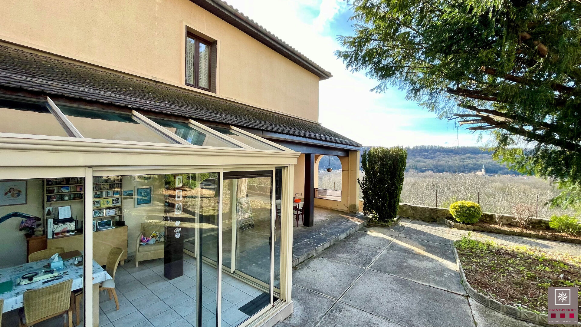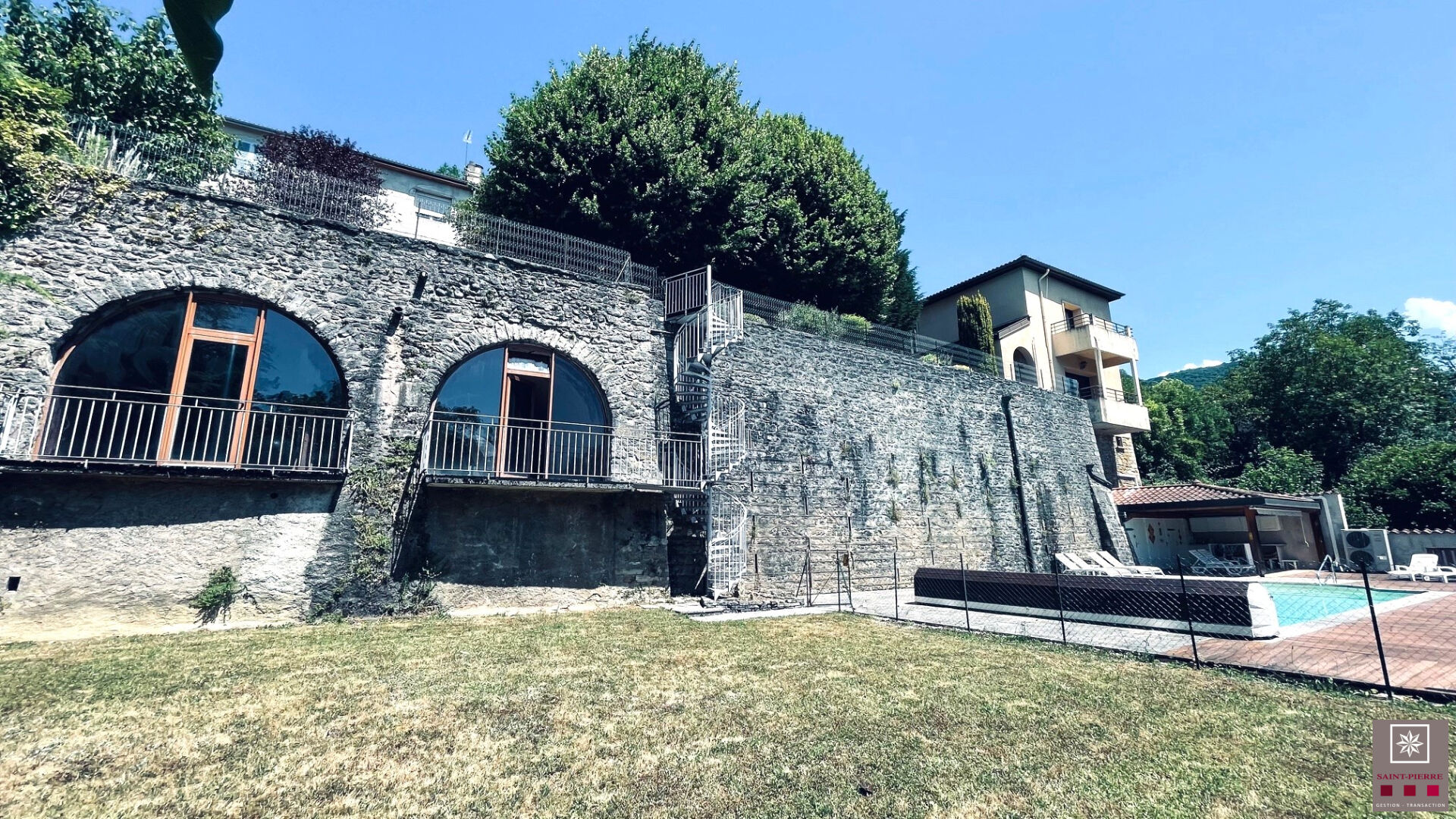 Sur les hauteurs du village de Saint-Germain à 5 minutes du centre d' Ambérieu en Bugey et à 15 minutes d' Ambronay, célèbre pour ses festivals de musique : Un ensemble immobilier rare, édifié sur un terrain de plus de 9 000 M² avec parcs et bois, composé de 2 maisons dont une bâtisse dominant les monts du Bugey et une deuxième maison à rénover, pour la famille ou la location saisonnière : en effet, la proximité avec le château de Saint-Germain, les chemins de randonnées vers le Lac Bleu et le festival de musique d' Ambronay, permettent aisément d'envisager un projet d'hébergement saisonnier, dans cette deuxième maison située à l'extrémité du parc qui bénéficie d'une entrée privative indépendante. La demeure principale, sur cave, est élevée sur un niveau et bénéficie d'une grande véranda donnant sur le jardin d'agrément. Au Sud-Ouest, deux terrasses surplombent la bâtisse : au Rez de Chaussée depuis le séjour et à l'étage depuis la chambre principale, permettant de profiter de la vue magnifique sur les monts du Bugey. Un aménagement sur deux niveaux, composés de 2 Chambres plus 1 bureau, 1 séjour cheminée, une salle à manger dans le prolongement de la cuisine, une arrière cuisine et une lingerie. La maison bénéficie de l'installation récente d'une climatisation sous pompe à chaleur réversible. La maison secondaire est composée de deux pièces principales plus cuisine, avec accès de plain-pied sur le jardin, ainsi qu'un préau permettant de garer 2 voitures plus une terrasse barbecue avec vue sur les monts du Bugey ; un grand garage double en sous-sol. Une particularité très rare complète ce bien : 2 salles voutées historiquement creusées dans la pierre surplombes le parc face aux monts du Bugey ; Un espace salle de sport est déjà aménagé et pourra évoluer vers un projet de cave à vin ou tout autre magnifique projet convivial. Sans oublier la grande piscine chauffée, avec son solarium et son pool house. 995 000 euros Honoraires inclus à la charge du vendeur. Un bien rare à visiter rapidement, contacter Christian MAILLET Régie Saint-Pierre Lyon