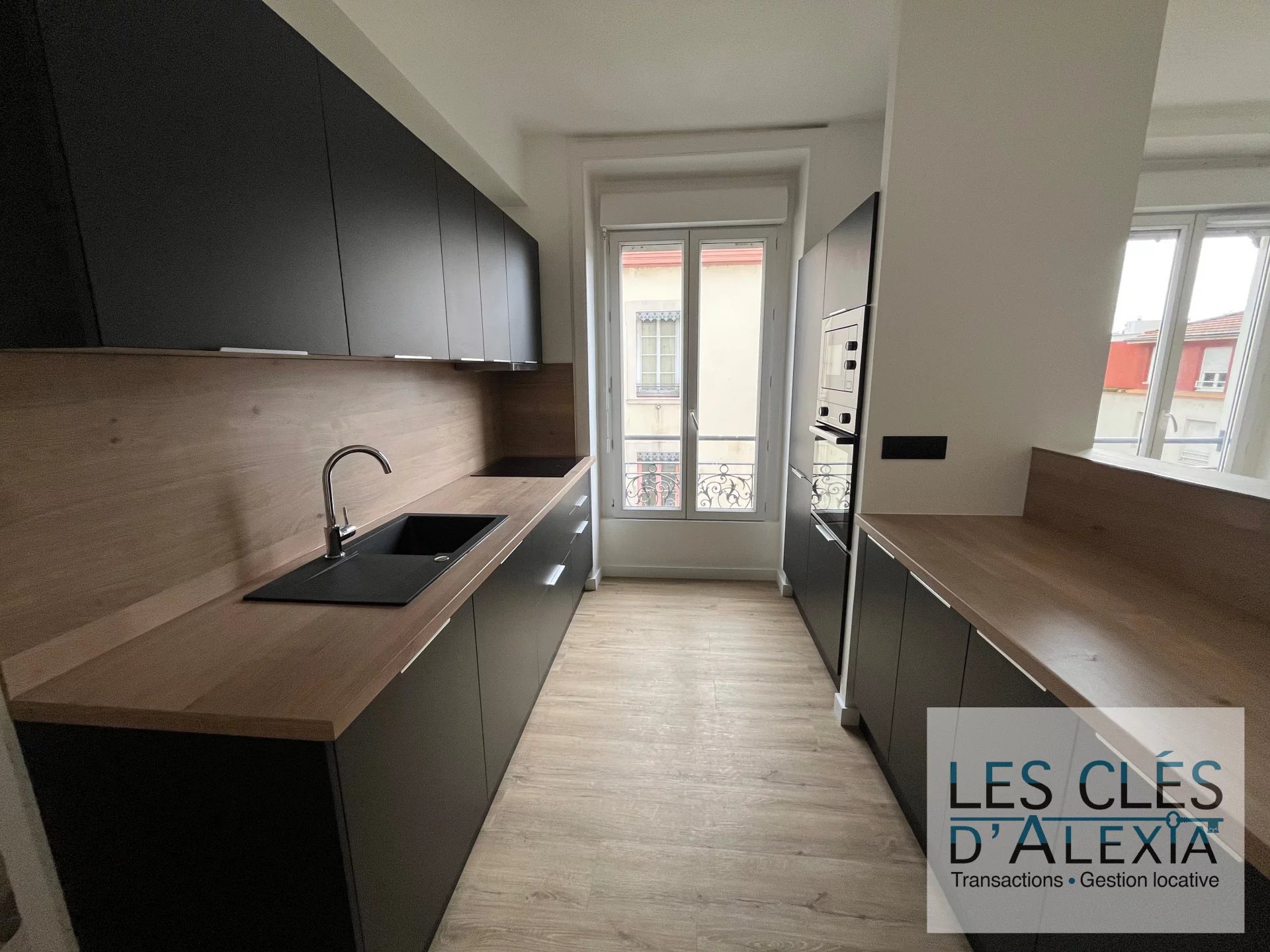 Entièrement rénové, l'appartement dispose d'une cuisine moderne haut de gamme, totalement équipée avec four, plaques de cuisson et de nombreux rangements, ouverte sur un séjour spacieux et chaleureux.
