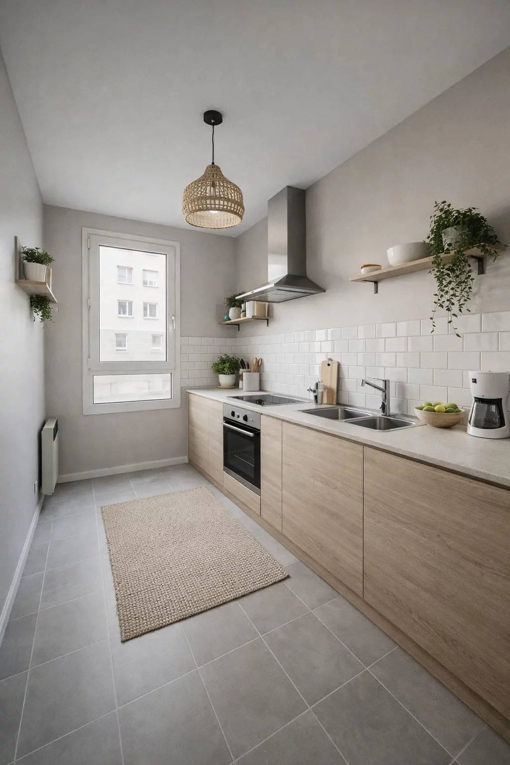 La cuisine est indépendante, carrelée, et bénéficie d’une fenêtre, un vrai plus au quotidien.