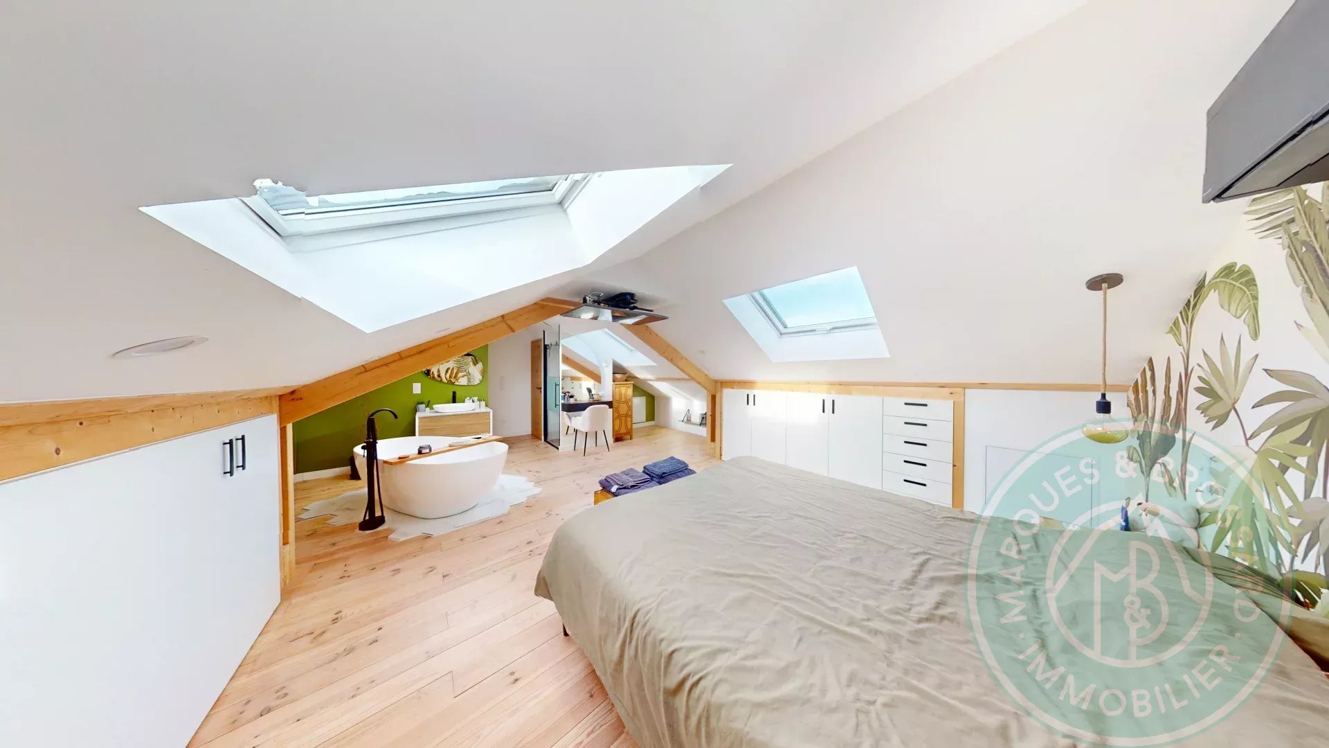À l’étage, une véritable suite parentale indépendante avec salle de bain complète et climatisation réversible crée un espace nuit confortable et intimiste.
