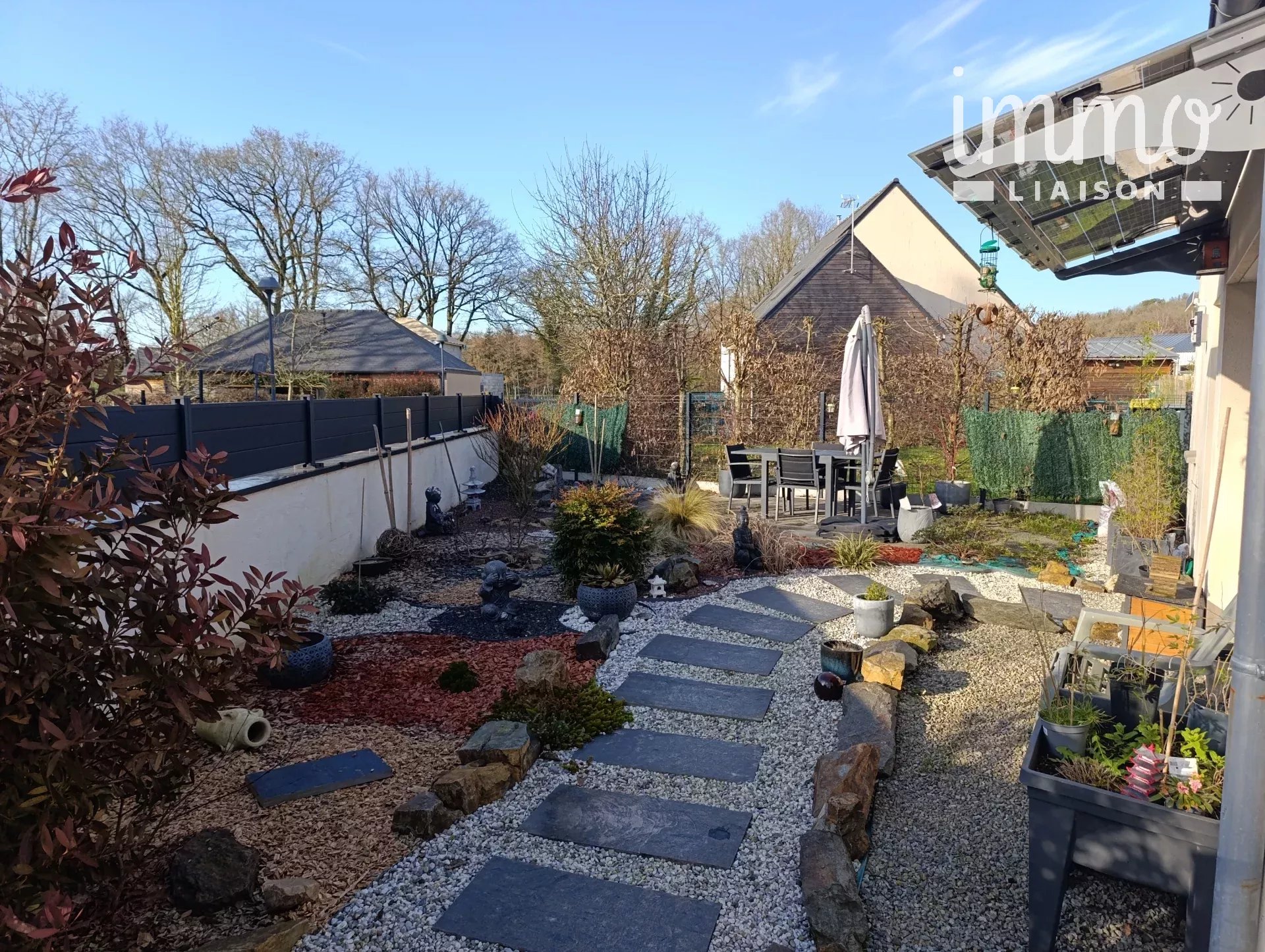 Implantée sur un terrain clos de 293 m², la maison bénéficie d’une vue dégagée sur le jardin, agrémenté d’un abri extérieur et d’une clôture rigide assurant intimité et sécurité. La maison dispose de deux places de stationnement en enrobé.